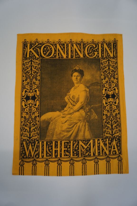 Gedenkdoek van bedrukt katoen in oranje en zwart met koningin Wilhelmina, ter gelegenheid van haar 25-jarig regeringsjubileum