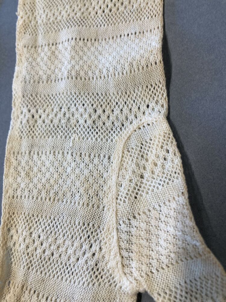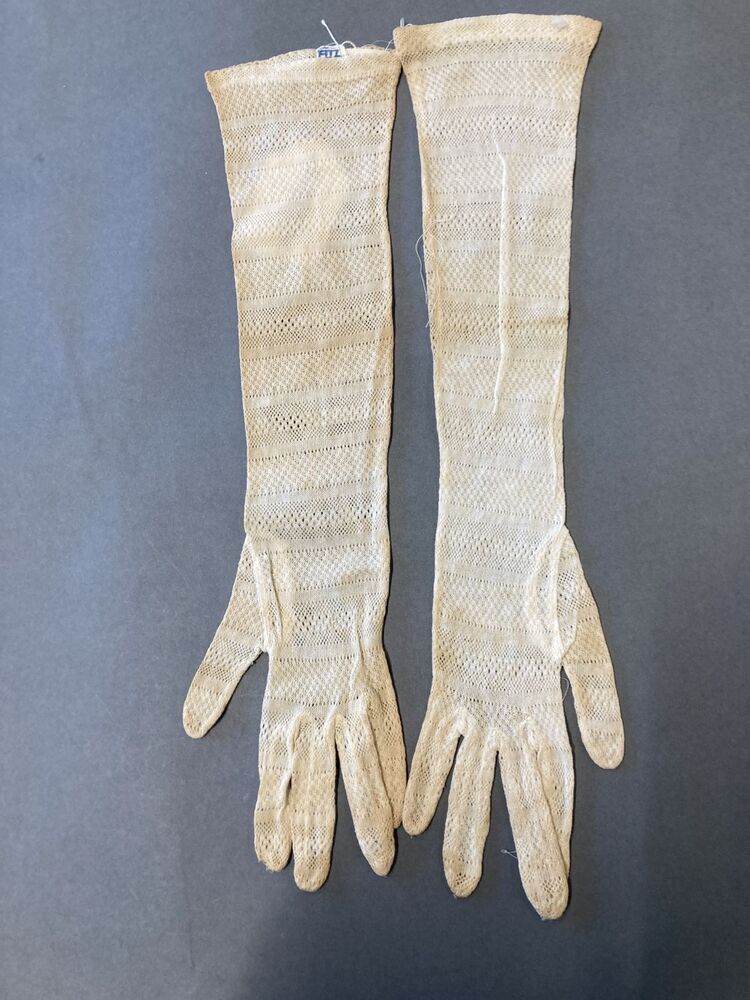 Paar witte katoenen machinaal gebreide handschoenen, twee soorten randen in de breedte