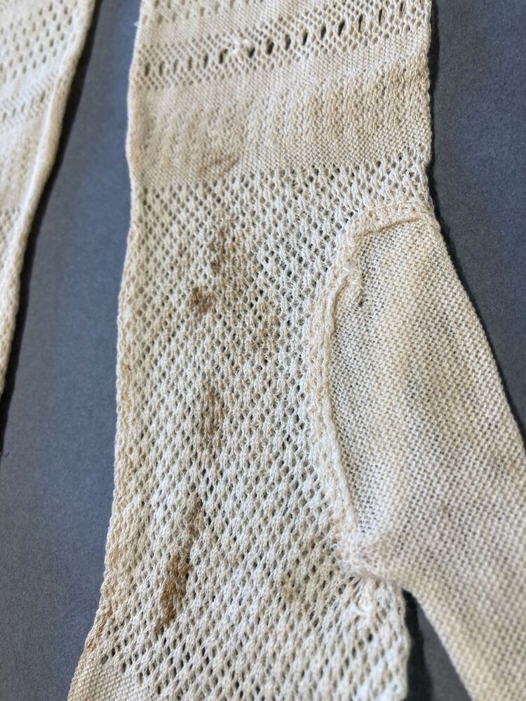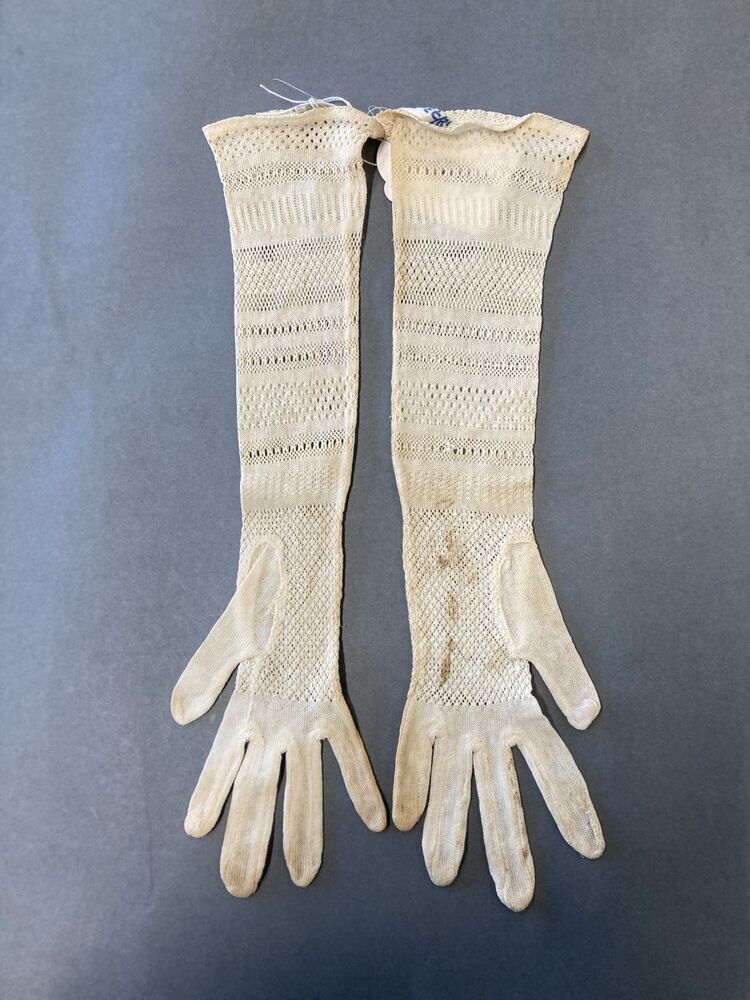 Paar machinaal gebreide wit katoenen handschoenen, met ajourpatroon in de hand en randen in de mouw