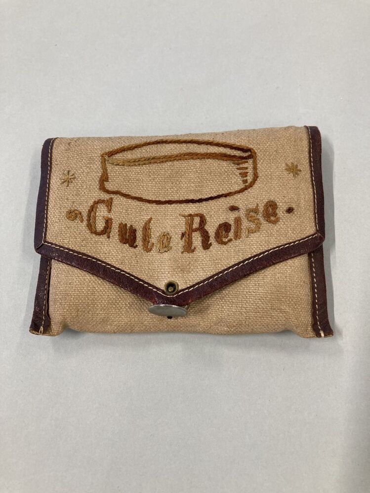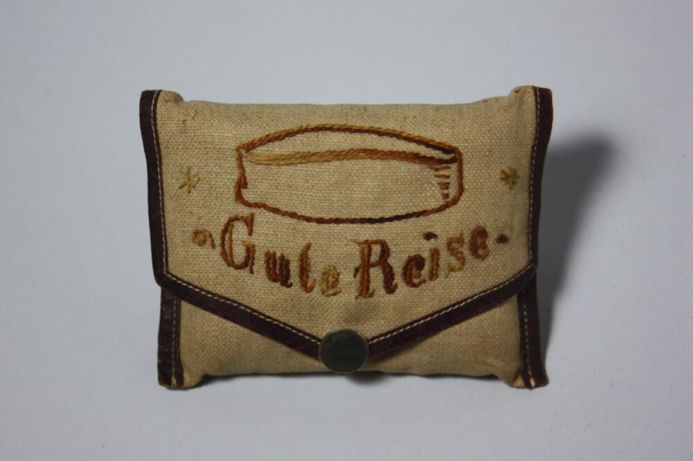 Lichtbruin linnen etui waarin een bruin mutsje, op de zak is het mutsje geborduurd met daaronder de tekst: Gute Reise