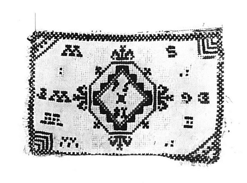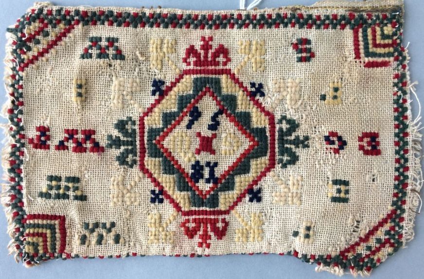 Borduurlap van stramien, kruissteek met wol, achthoek met pijlen, met in het hart 1856 GW