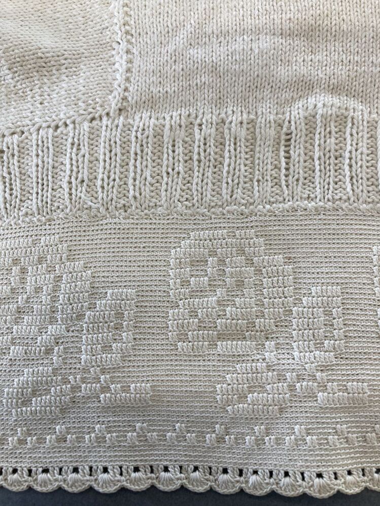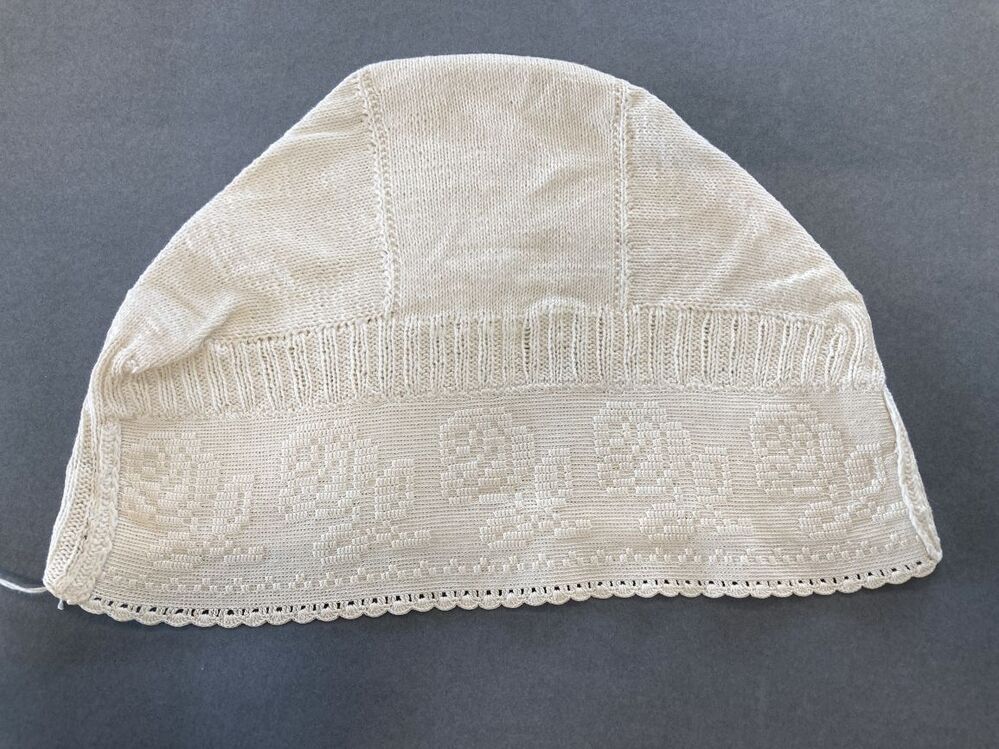 Tipmuts met gebreide bol van wit katoen en gehaakte nekstrook met roospatroon