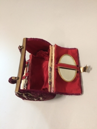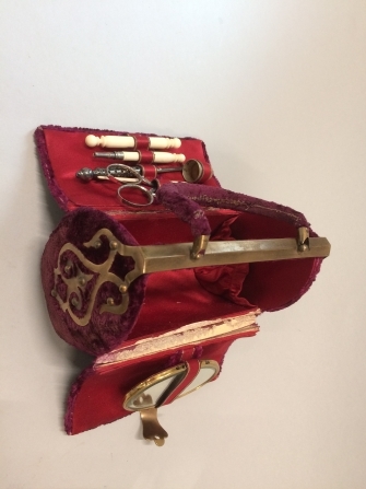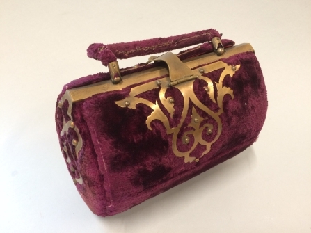 Handwerk-etui van paars fluweel met koper beslag gevoerd met satijn