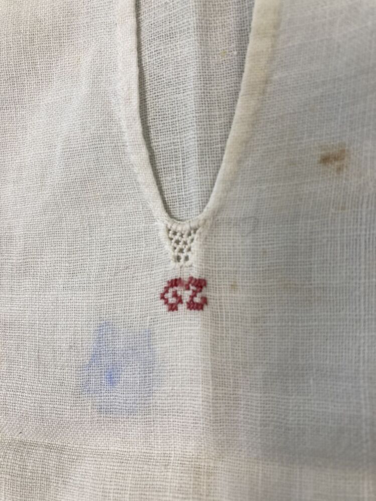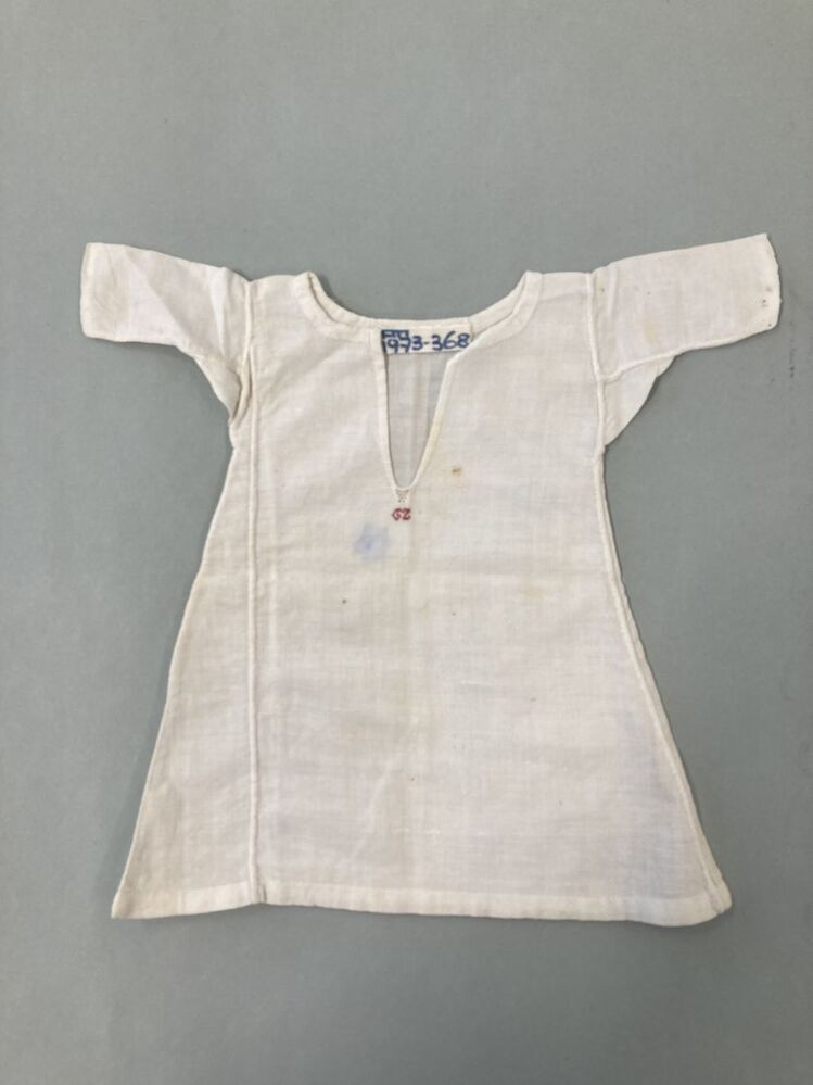 Hemd voor een pop van wit katoen, met initialen in rode kruissteek: GZ