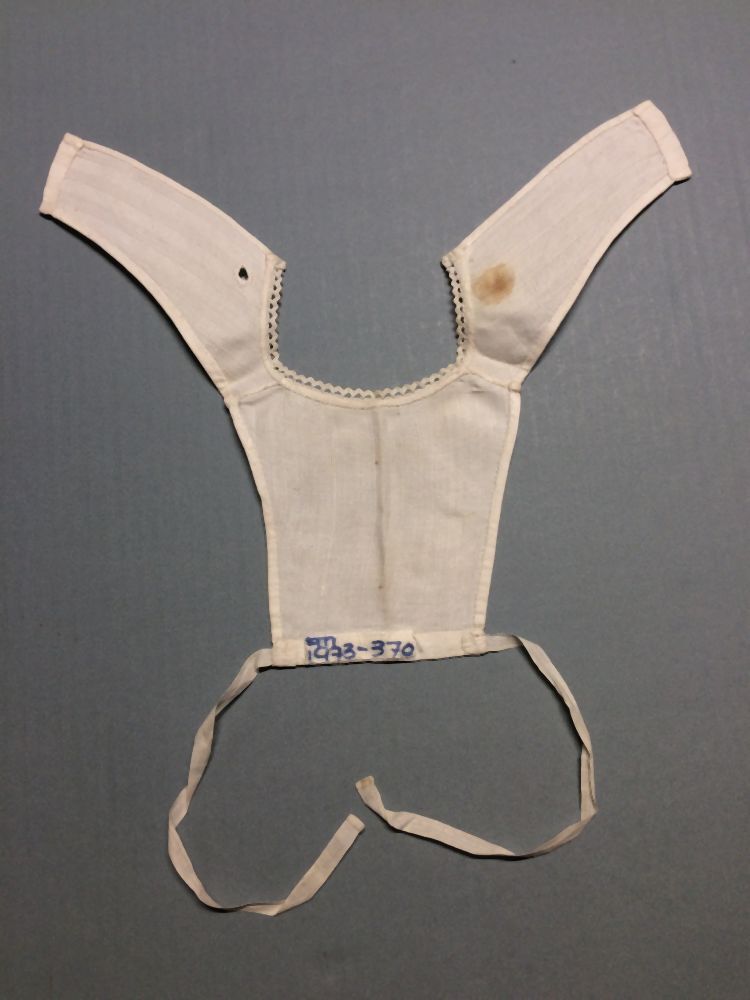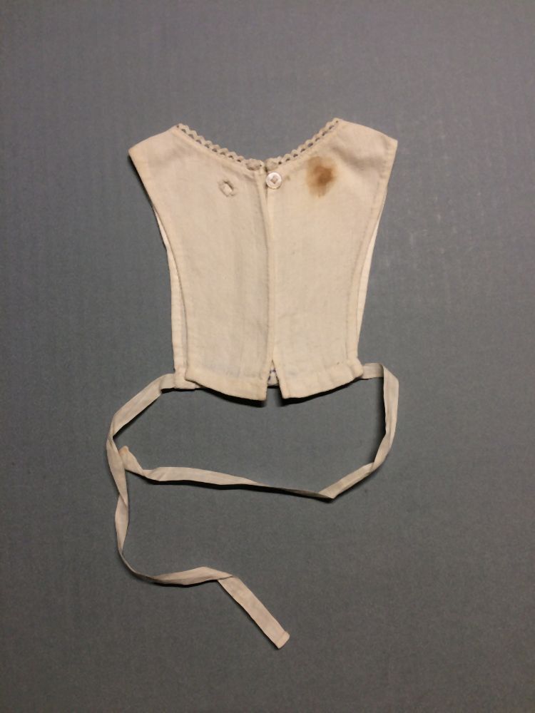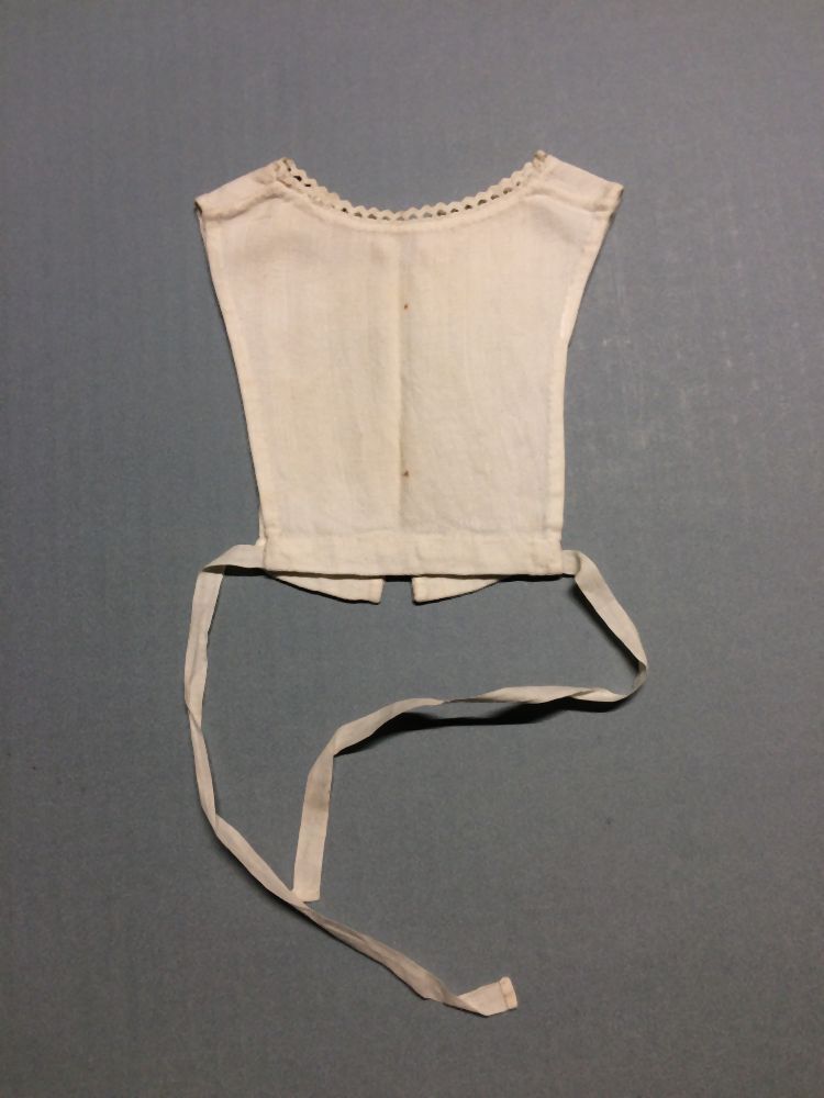Poppenchemisette van wit linnen met ingeweven strepen, zigzagbandje langs de hals, parelmoer knoopje, met strikbanden