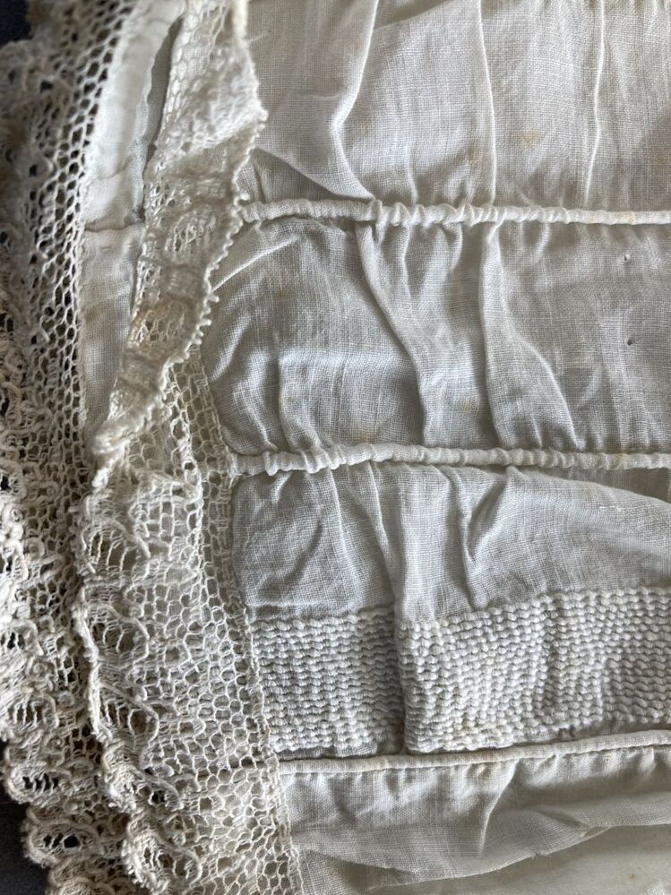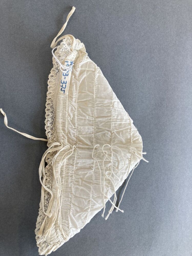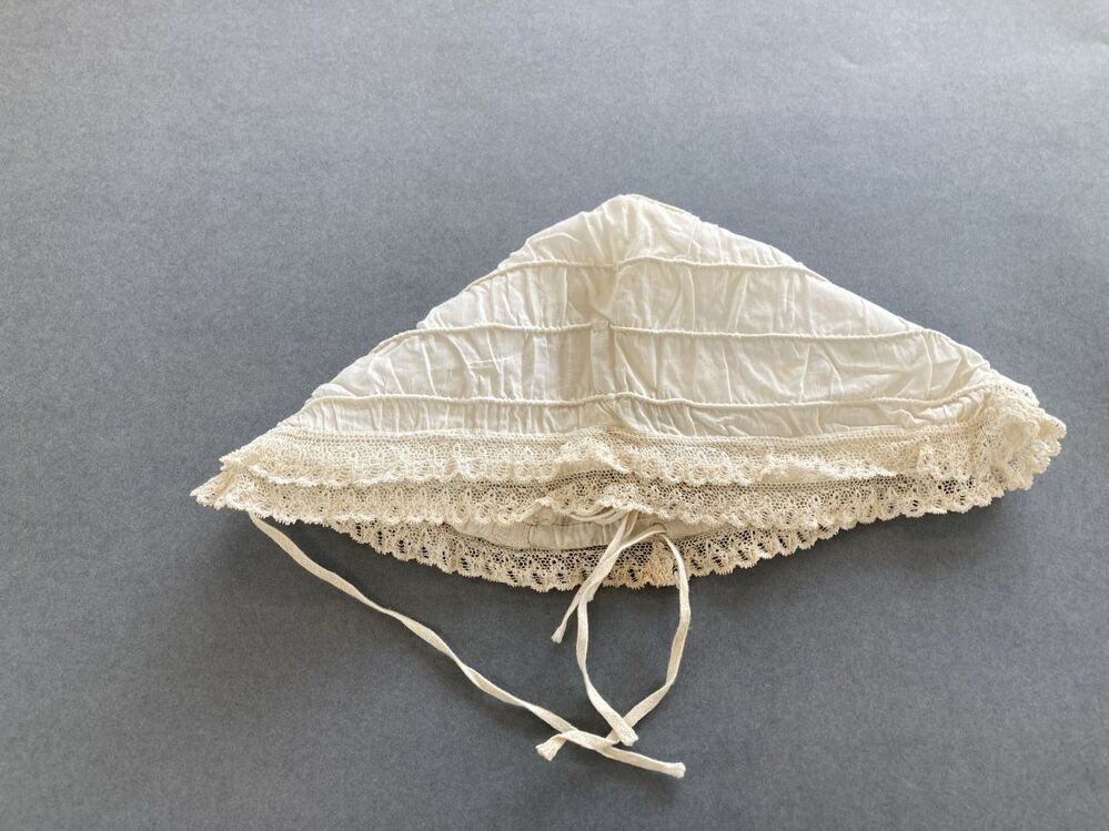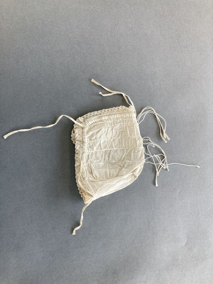 Kindermuts van batist met rolzoompjes waardoor koordjes, afgezet met twee stroken machinaal kant.