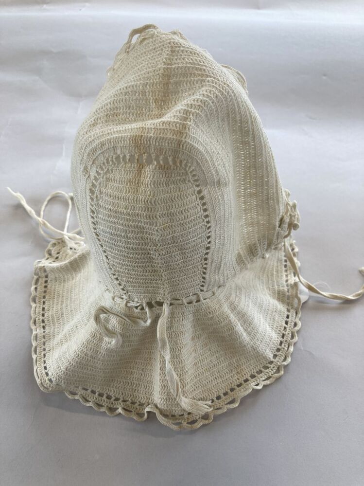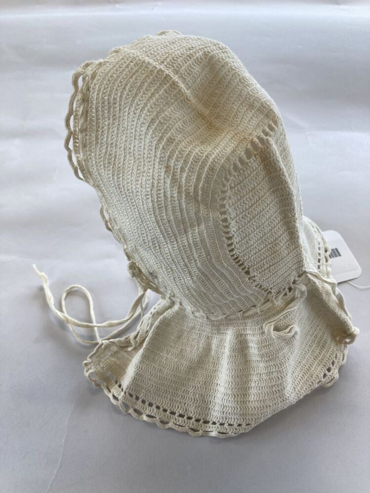 Kindermutsje, dicht gehaakt met wit katoen, bestaande uit bol en wijde afhangende strook