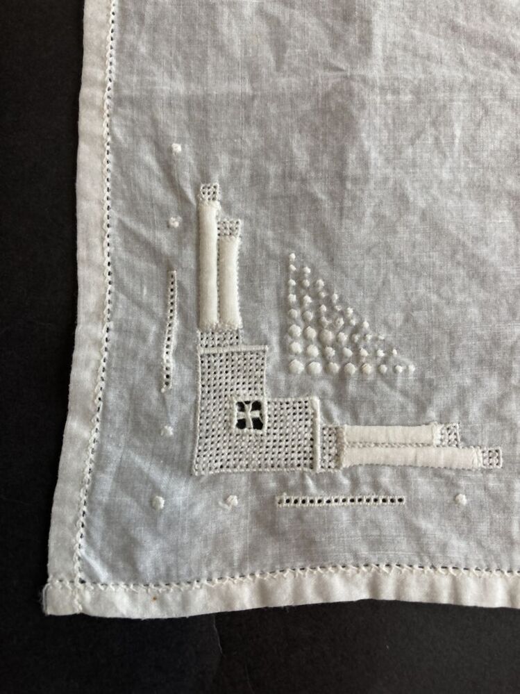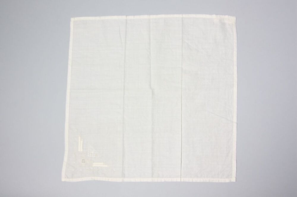 Zakdoek van wit batist met in hoek geometrische versiering, frans geborduurd, zaans stikwerk en perzisch ajour