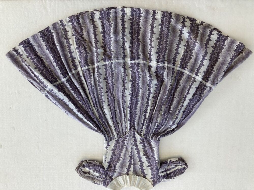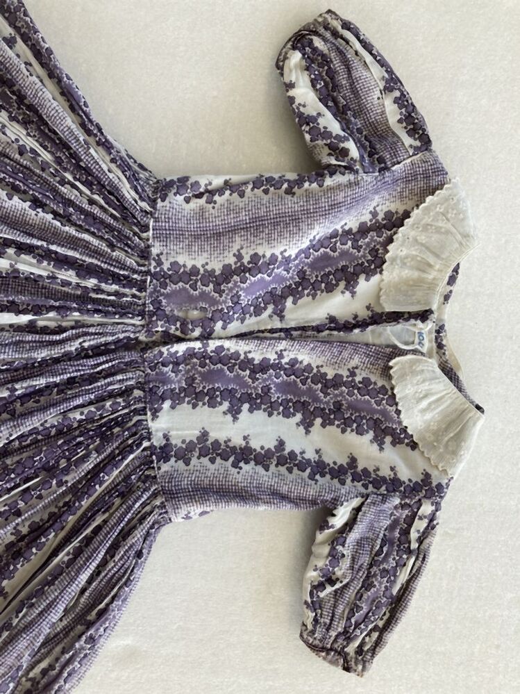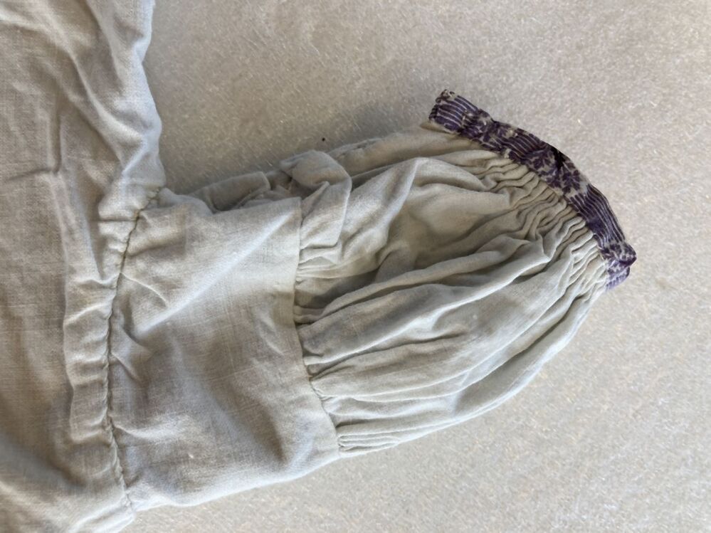 Jurkje van bedrukt neteldoek, wit fond waarop lengte strepen òf wolken van bloemachtige figuren, donker en lichtpaars