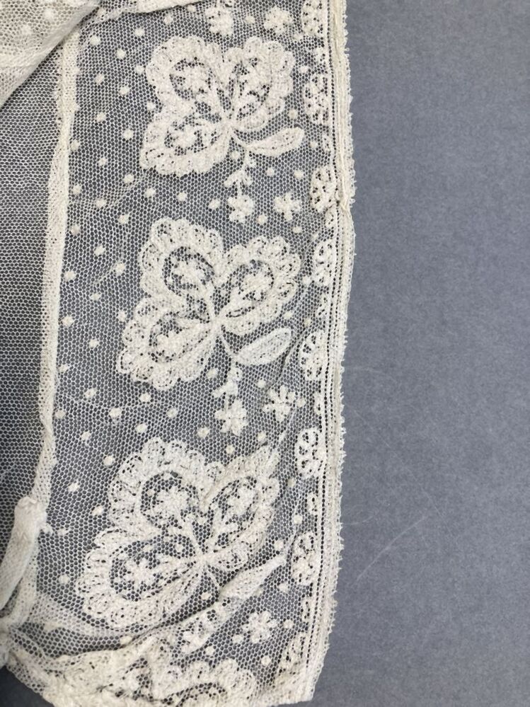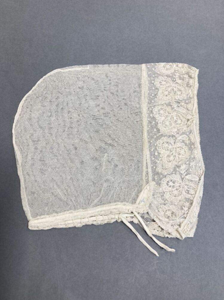 muts van witte tule, langs gezicht een getamboereerde strook