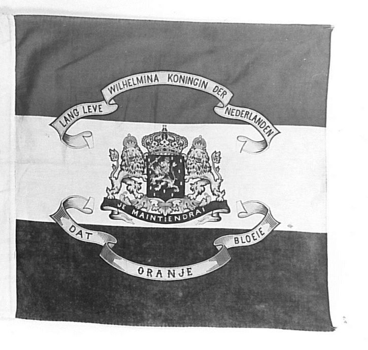 Vlag waarop rijkswapen'Je maintiendrai', Lang leve Wilhelmina, Koningin der Nederlanden Dat Oranje bloeie