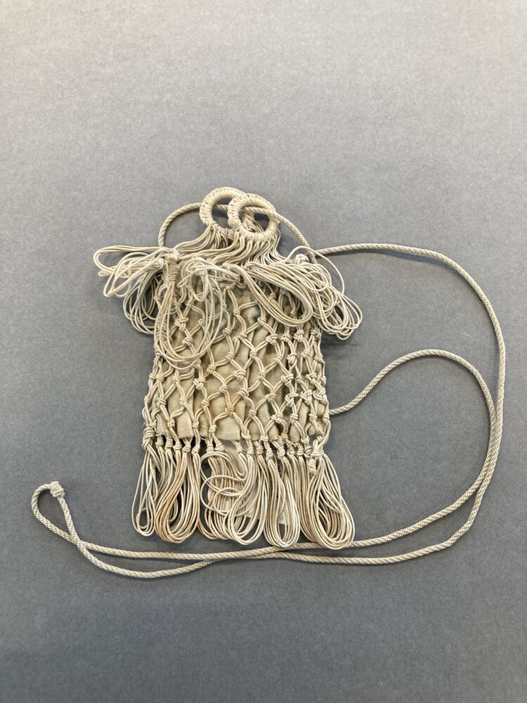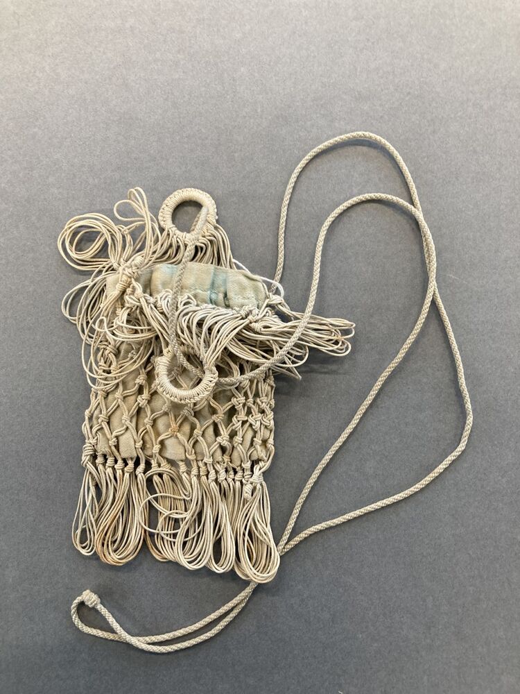 Tasje van lichtblauw geknoopt touw met aan de bovenzijde tweemaal een ring waardoor een koord loopt