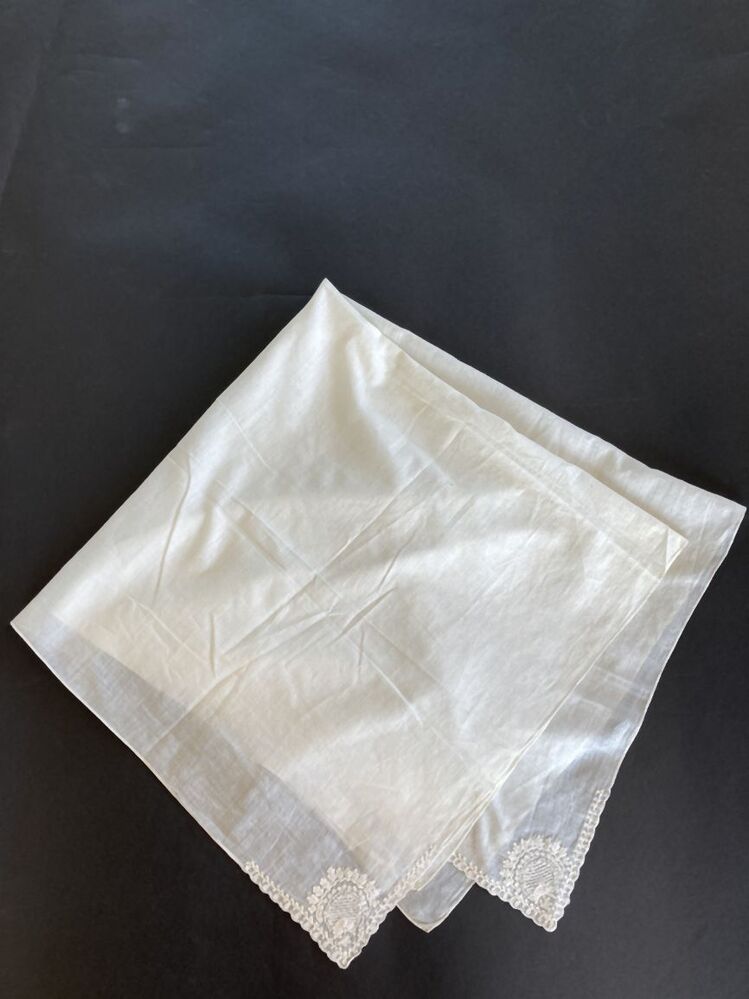 Vierkante halsdoek van batist, twee hoeken versierd met tamboereerwerk, floraal hoekmotief en randje