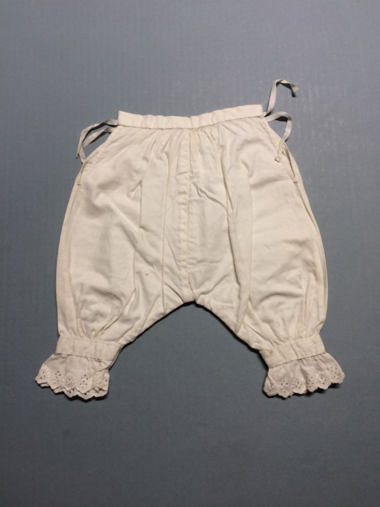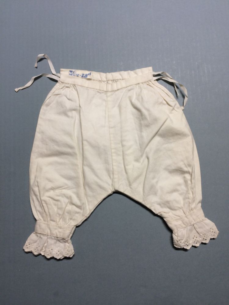 Onderbroek, katoen, broderie langs de zoom van de pijp, onderdeel van groep van tien stuks poppenkleren