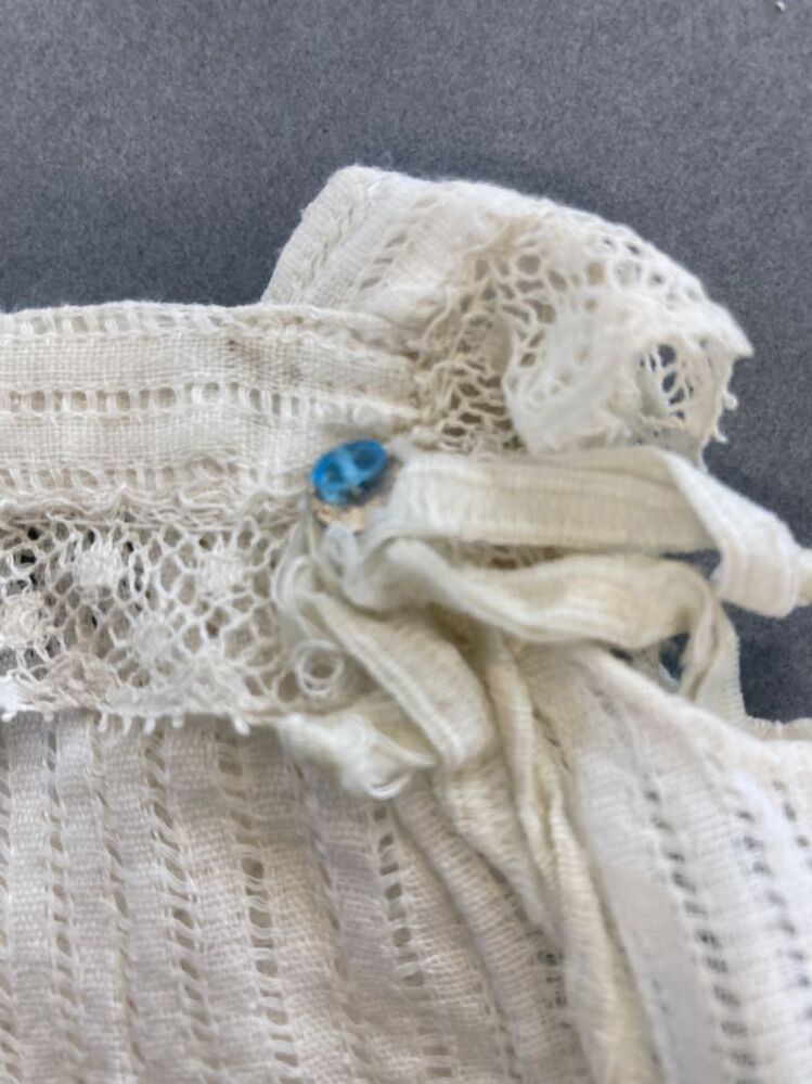 Boezelaar voor een pop, ajour gestreept katoen afgezet met machinaal kant