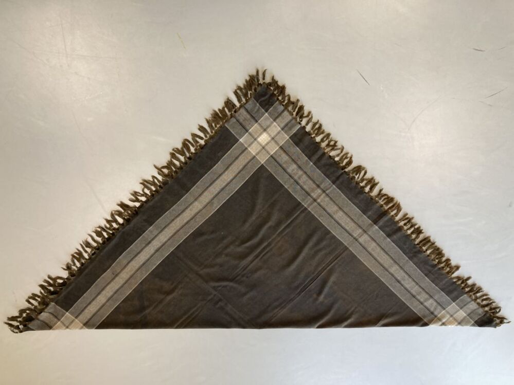 Omslagdoek van bruine wol met strepen en rondom groene franje in bundels