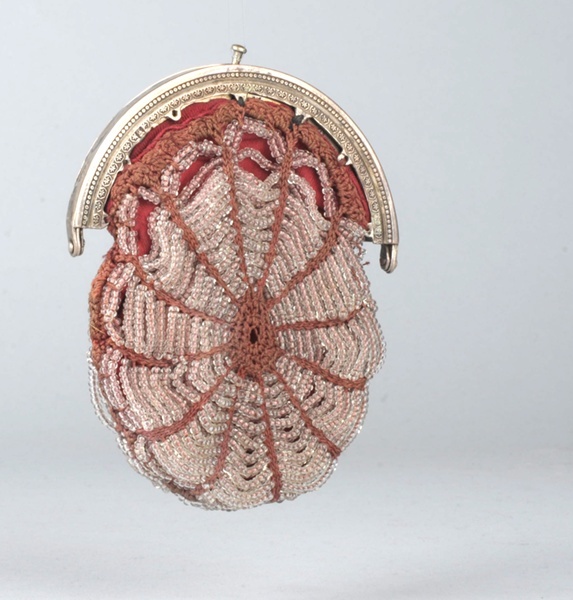 Beursje met halfronde zilveren beugel met stempelwerk, aan kralenbeursje