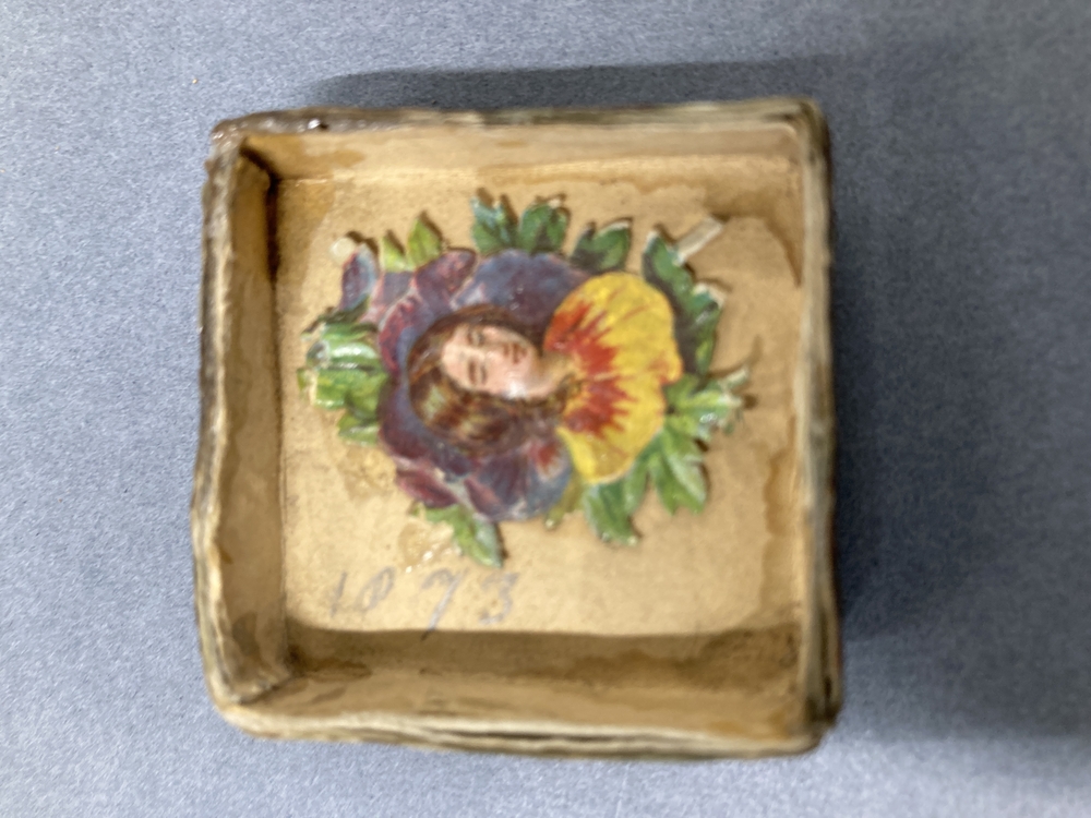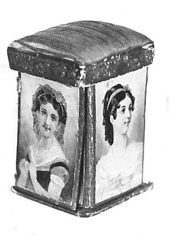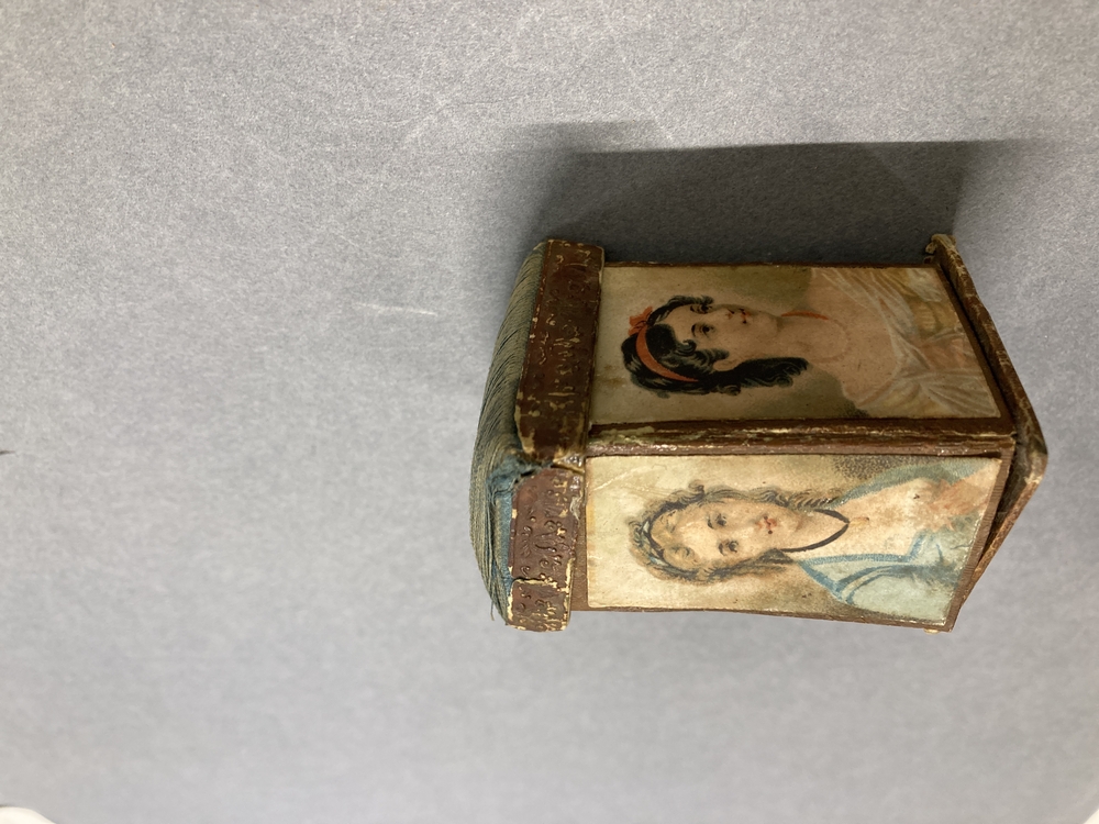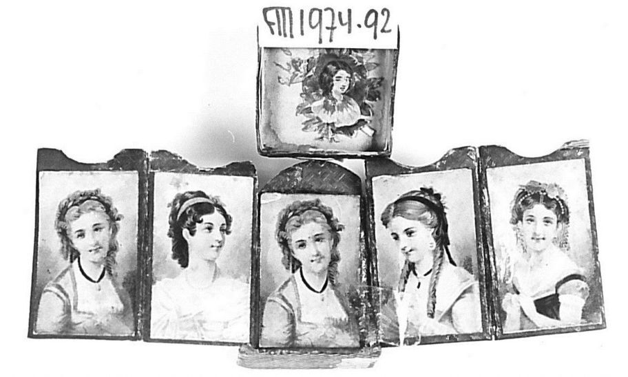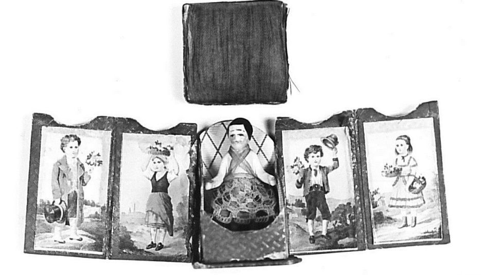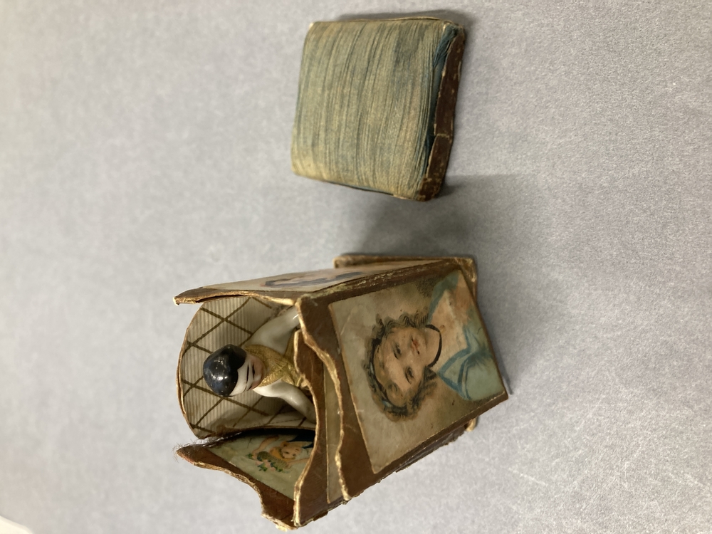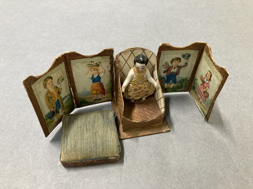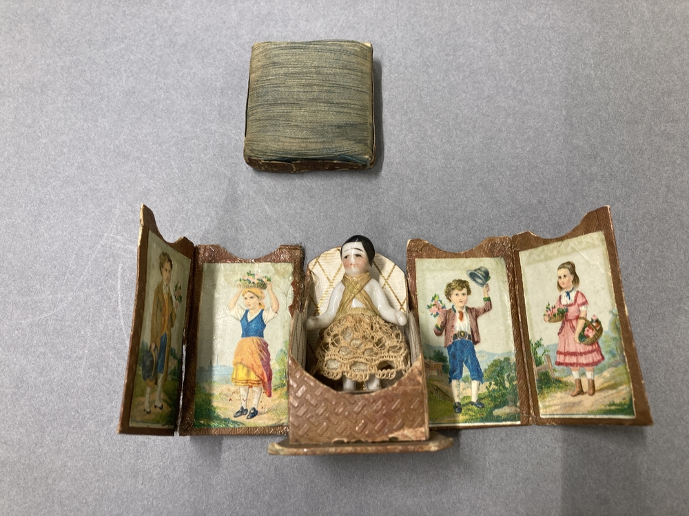 Pop in doosje met uitklapbare wanden waarop voorstellingen van vrouwen en kinderen, binnenin een porseleinen pop