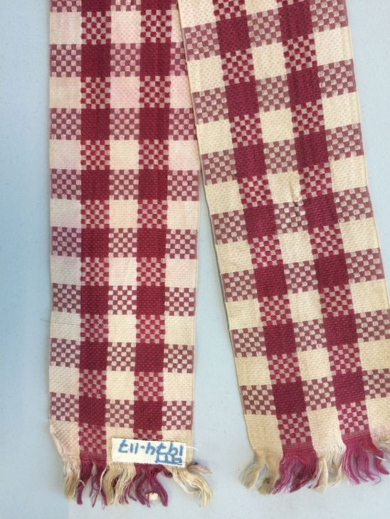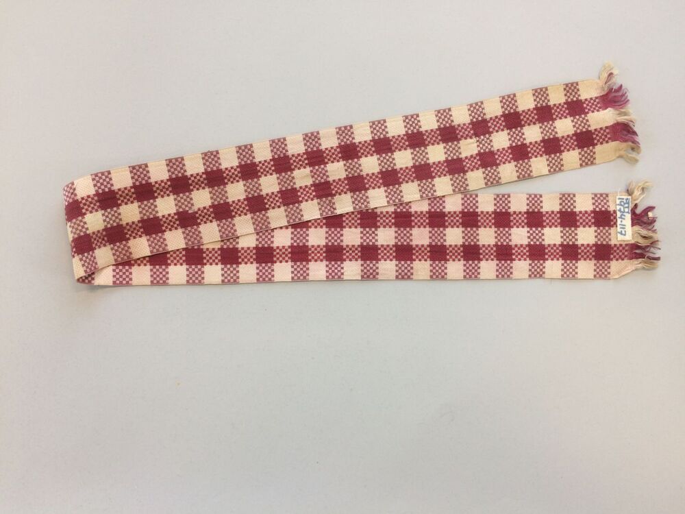 Geruit sjaaltje van paarsrood-witte zijde fantasie platbinding