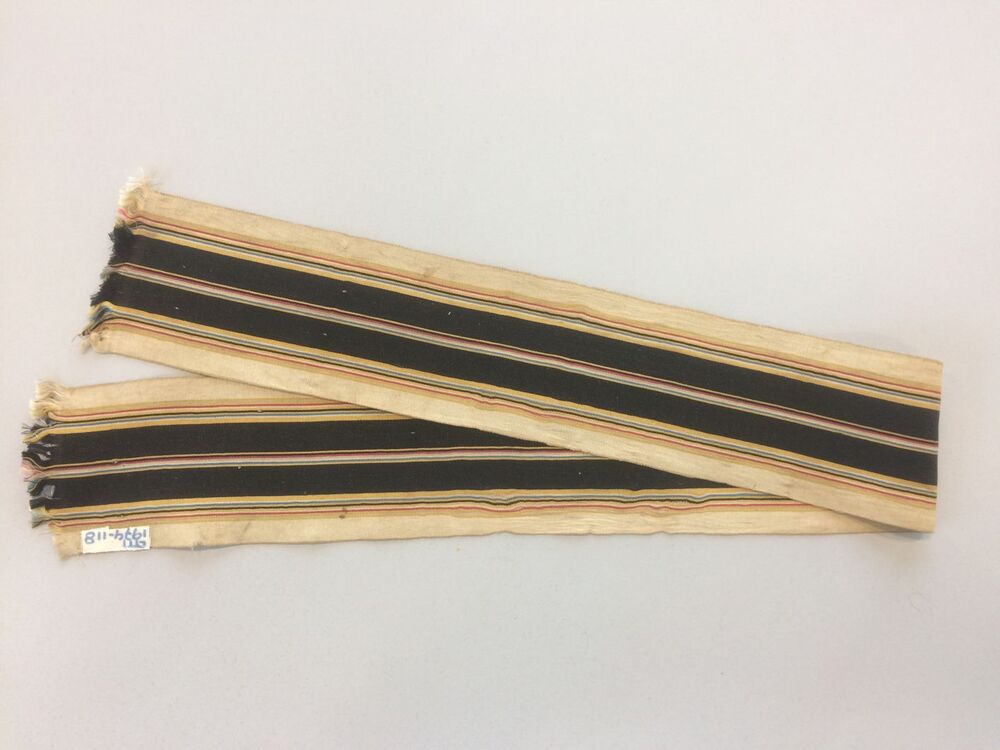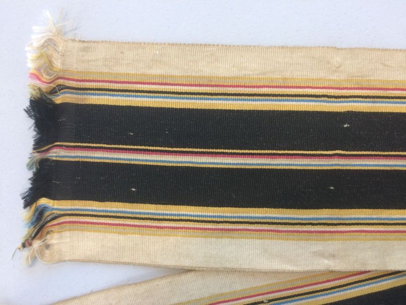 Gestreept sjaaltje in ribsbinding geweven, veelkleurig, afwisselend brede en bundel smalle strepen