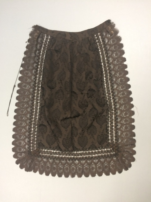 Schort van zwart katoen, langs zij-en onderkant een strook kralen passement
