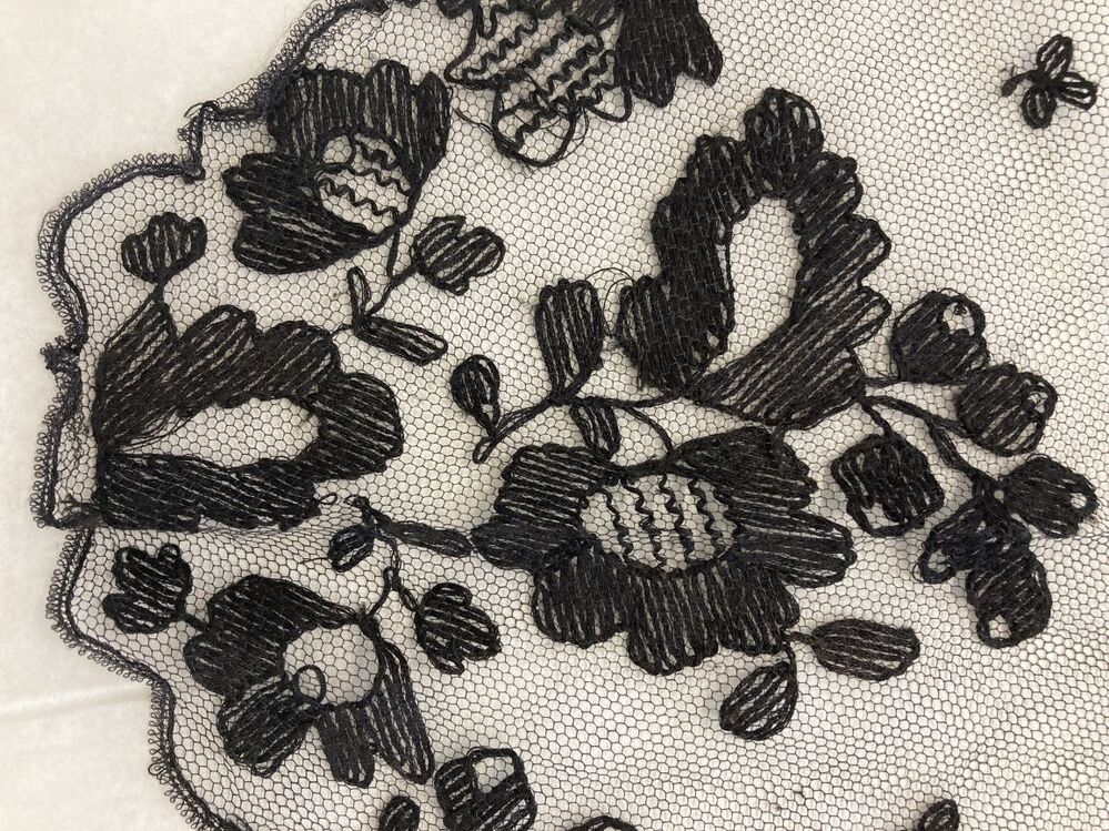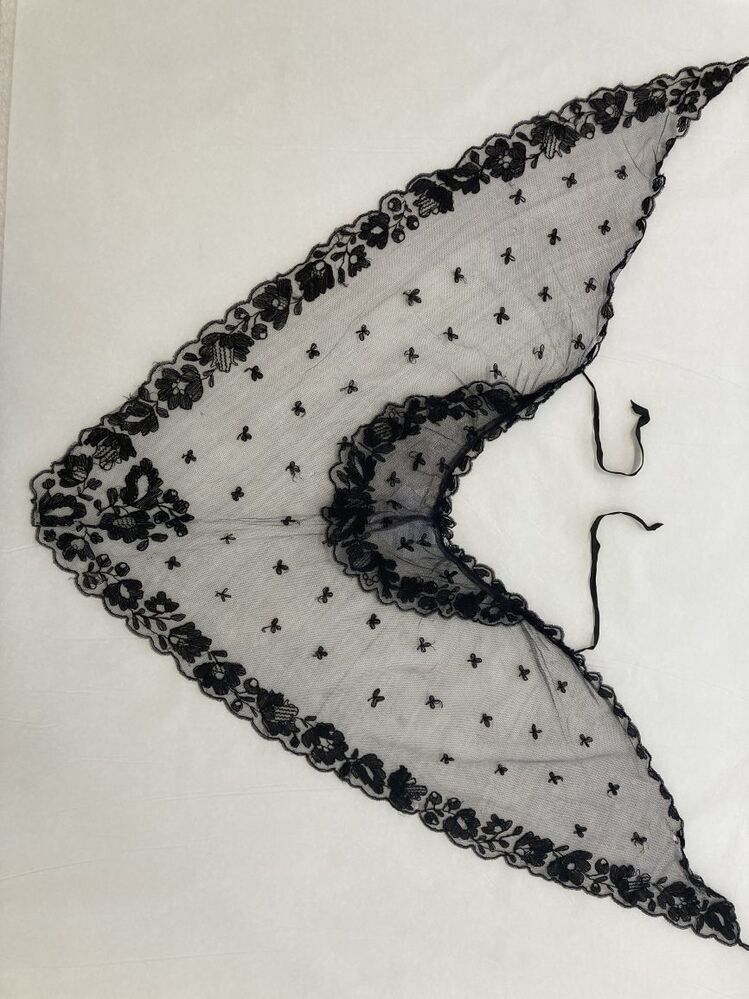 Zwarte tule fichu met kraag van doorgestopte zwarte tule met vrij dik garen