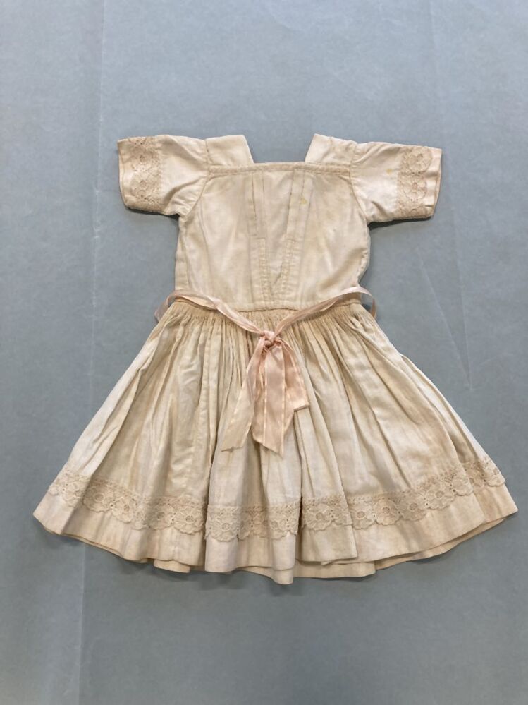 Wit katoenen kinderjurkje met rimpelrok, afgezet met machinale kant