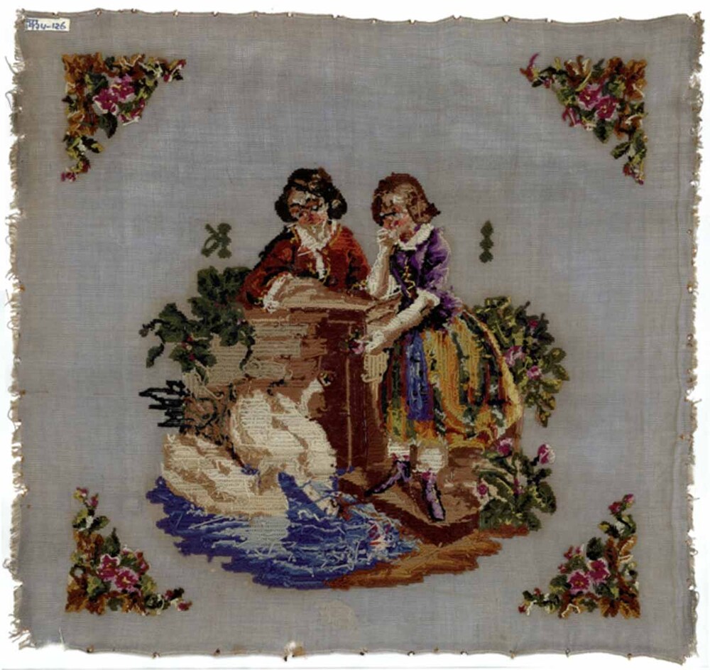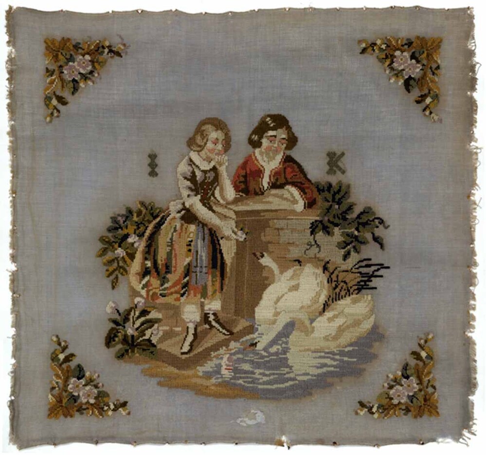 Borduurstuk op lichtblauwe ondergrond met tafereel, gemerkt I.K.