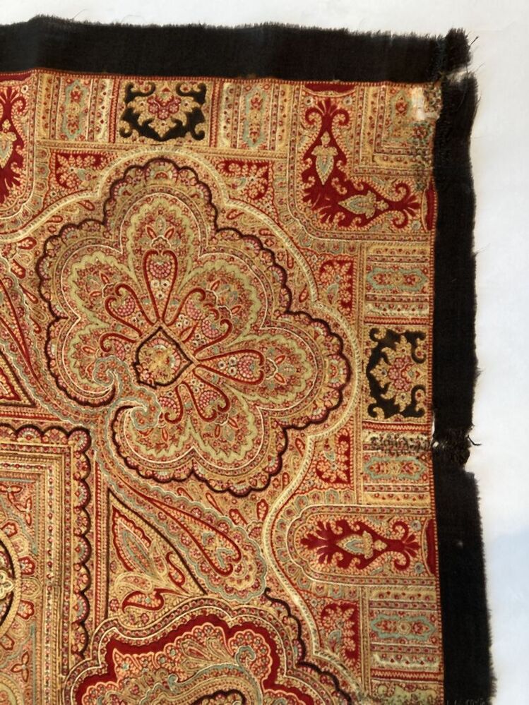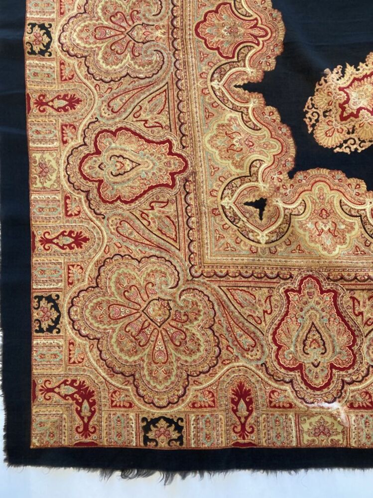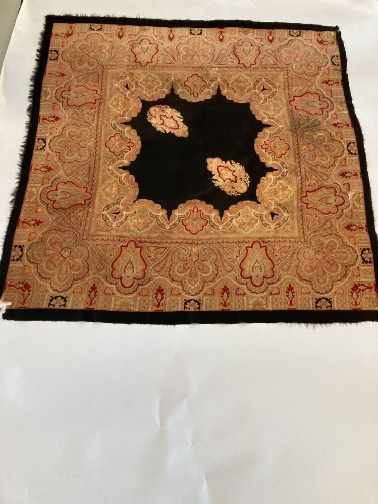 Zwarte kasjmierdoek van wollen kamgaren, bedrukte brede rand met onder andere poortjes
