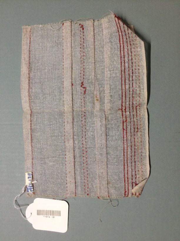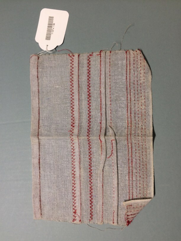 Naailap van grijs stramien, benaaid met rood katoen, rijgsteek, stiksteek en flanelsteek
