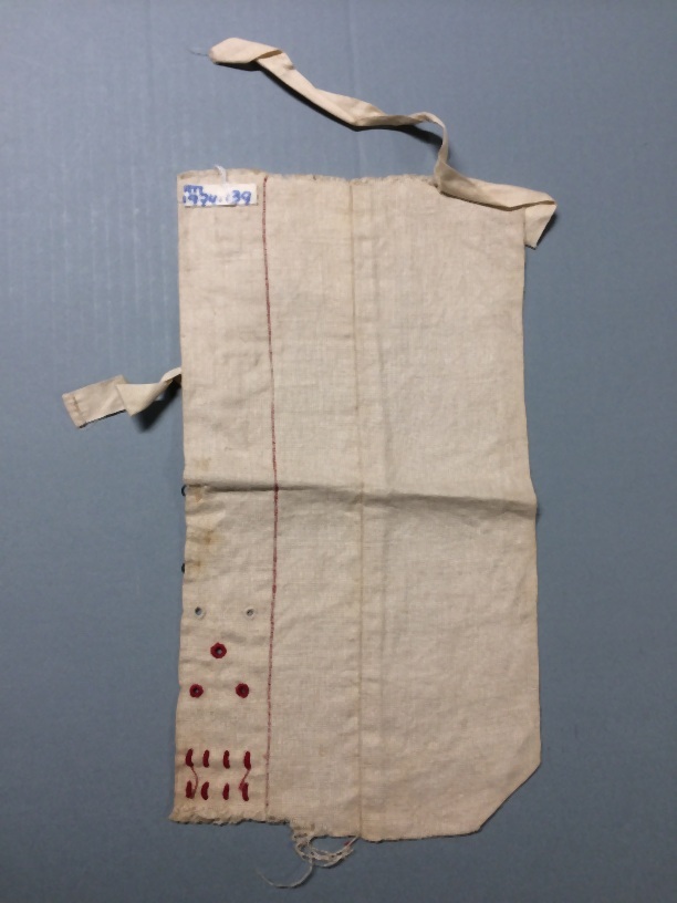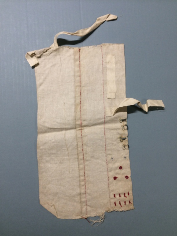Naailap van van wit linnen, trensjes, nestelgaatjes, haken en ogen, bandjes vastzetten, engelse naad