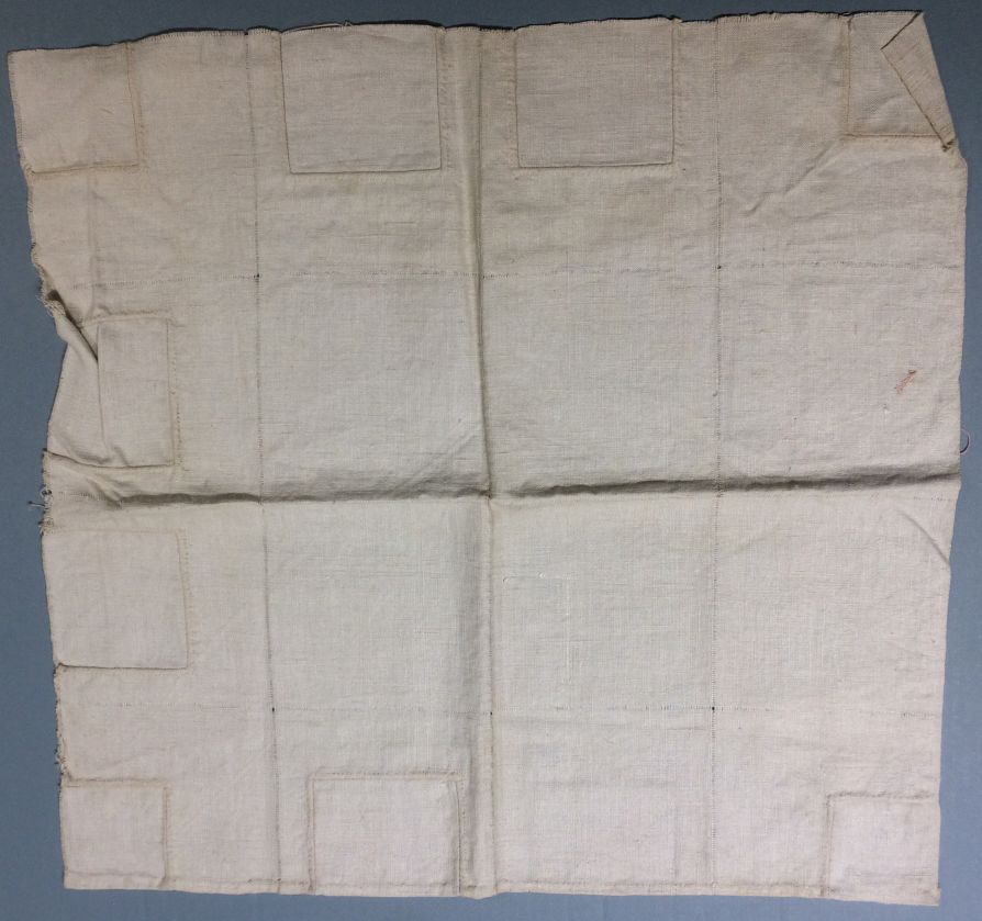 Stoplap van linnen verdeeld in zestien vakken, hierin zijn proeven van verstelwerk gedaan