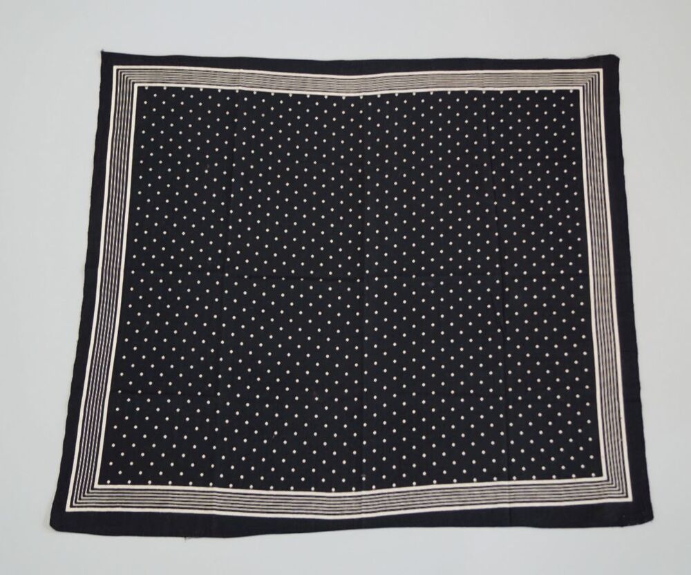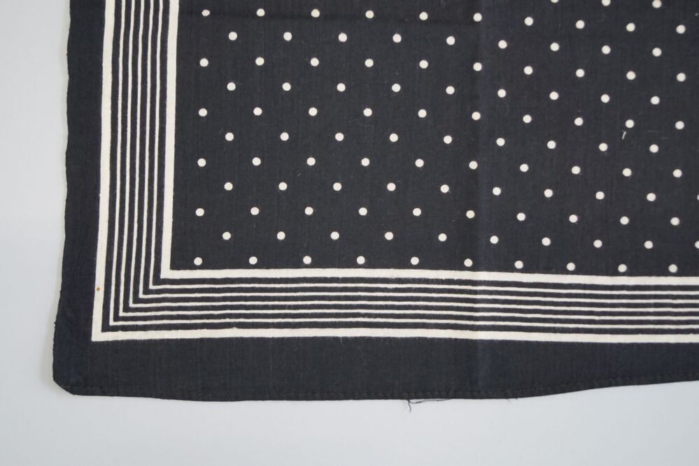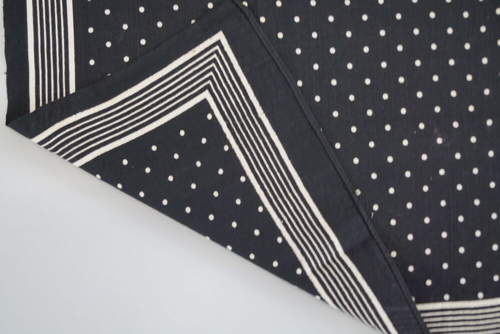 Doek van bedrukt katoen in zwart met witte stippen en gestreepte rand
