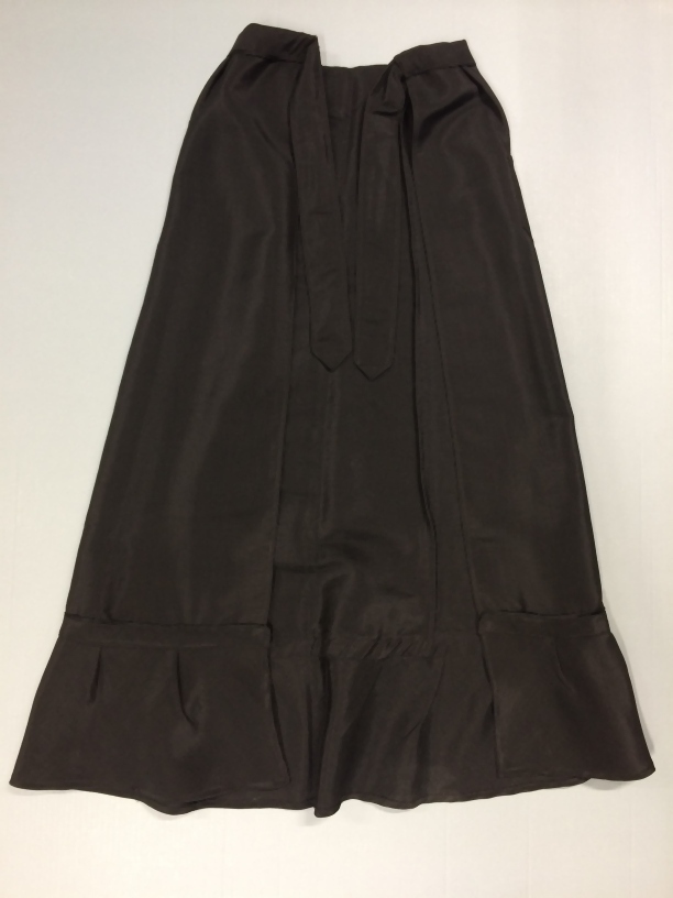 Boezelaar van zwarte glanzende wol, langs de zoom een volant en een zak, aan tailleband twee banden, onderdeel van groep