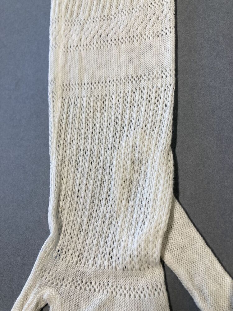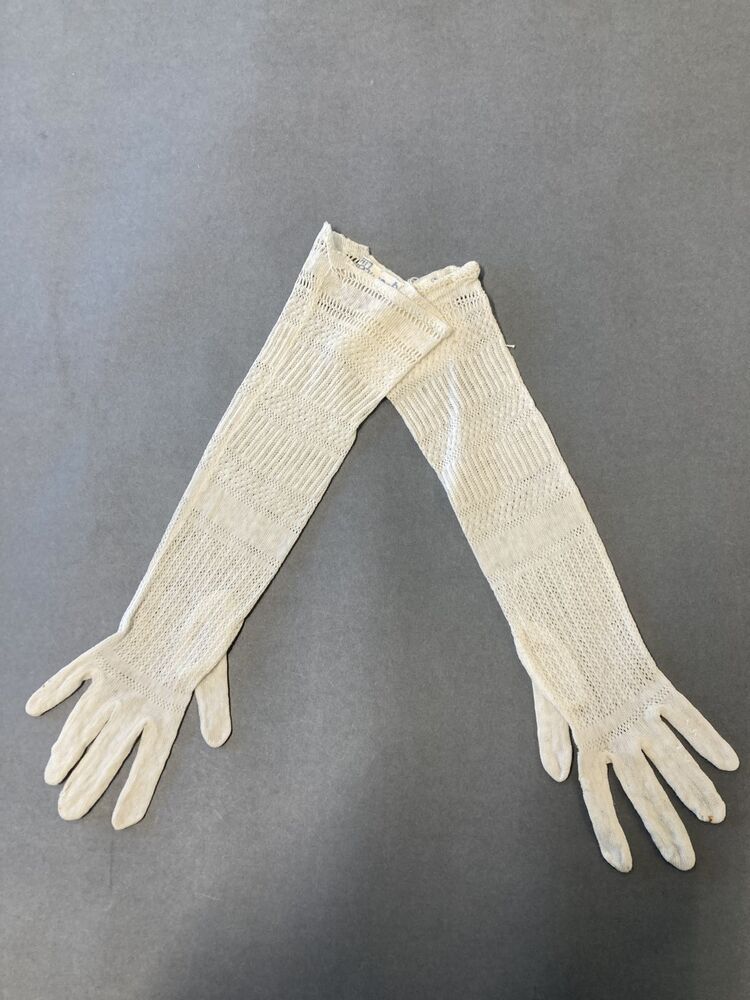 Paar wit katoenen machinaal ajour gebreide vrouwen handschoenen