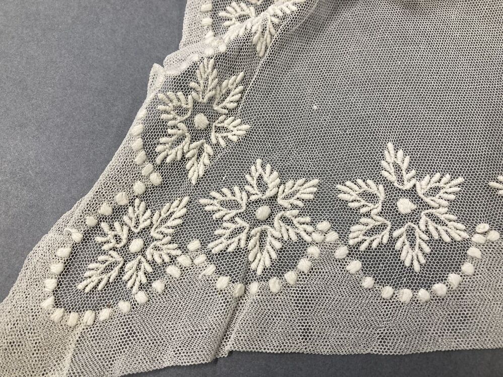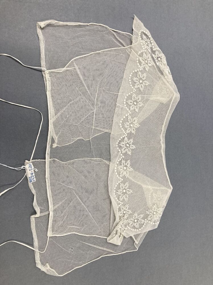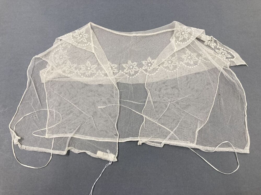platliggende Lijfje of kroplap van geborduurde tule met puntige kraag