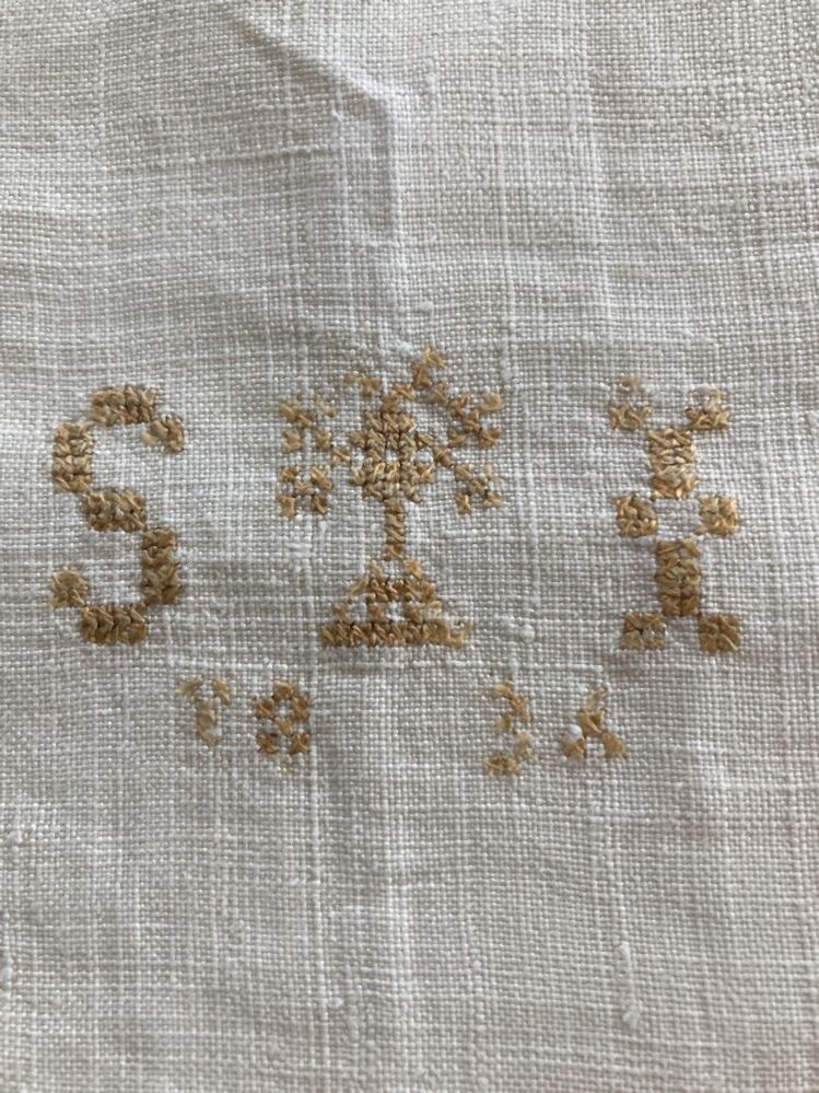 Linnen laken voor een kind, met zijde borduursel in kruissteek , initialen S boompje I 1836