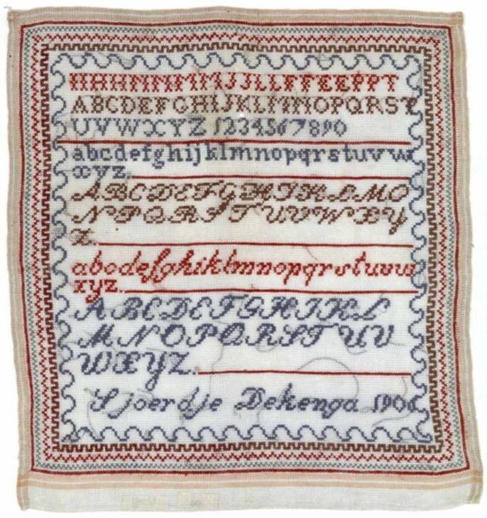Letterlap in rood, bruin en blauw gemerkt Sjoerdje Dekenga, 1906