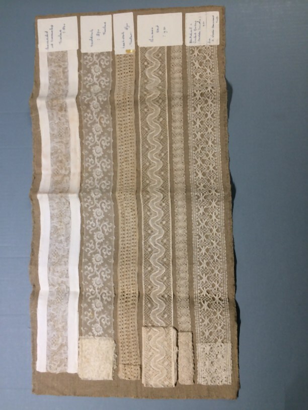 Kantstroken op een doek genaaid als voorbeeld, machinaal kant, haakwerk en kloskant