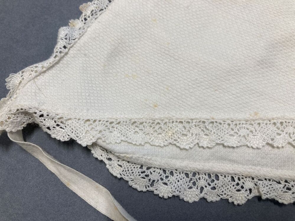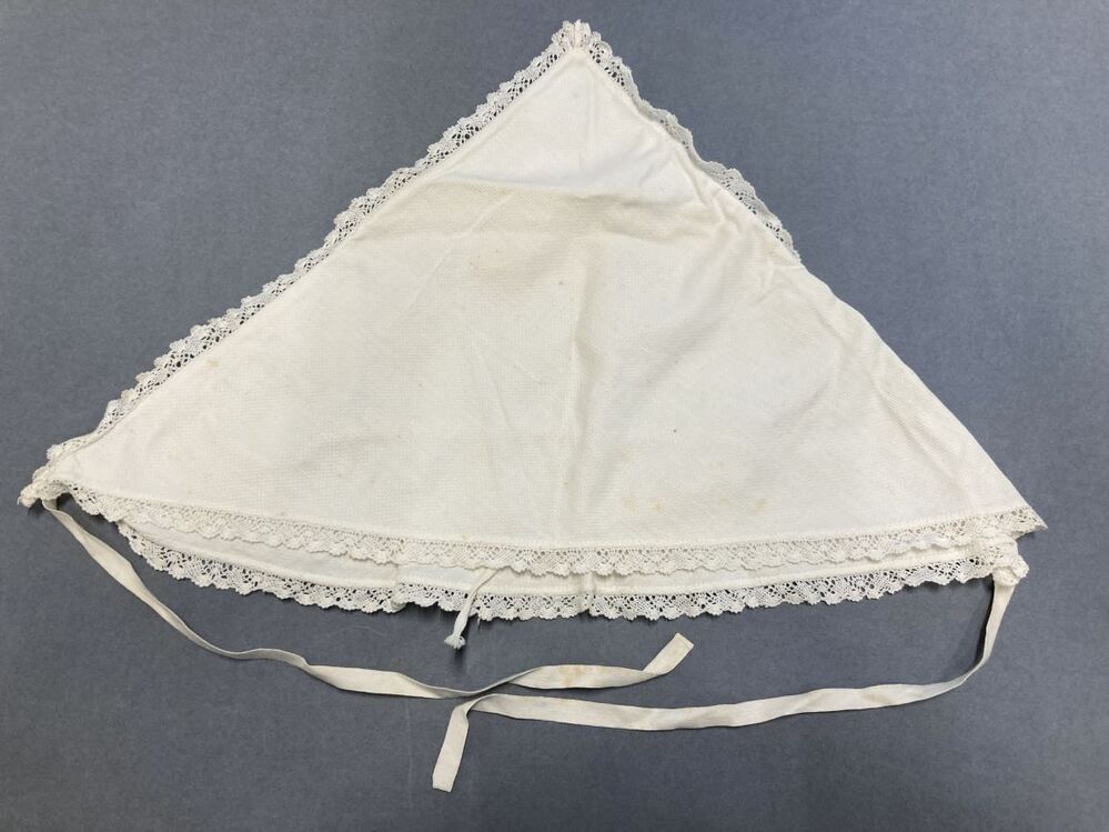 Kookmuts afgezet met kloskantje van wit oogjeskatoen als basisvorm een driehoek met sluef en trekband in de nek
