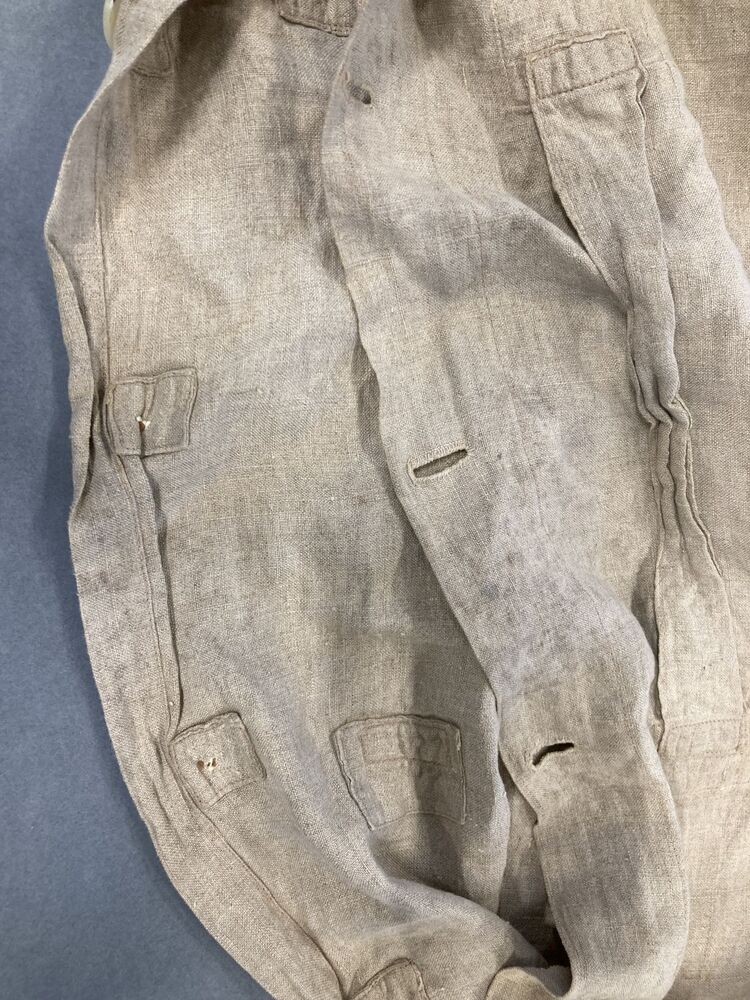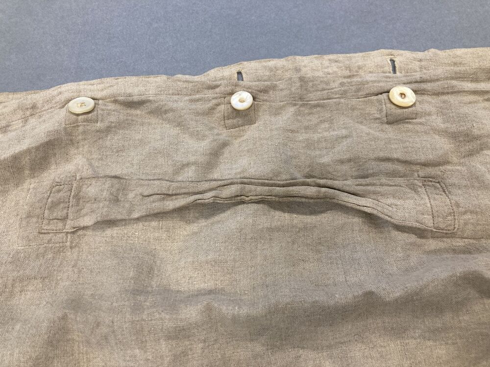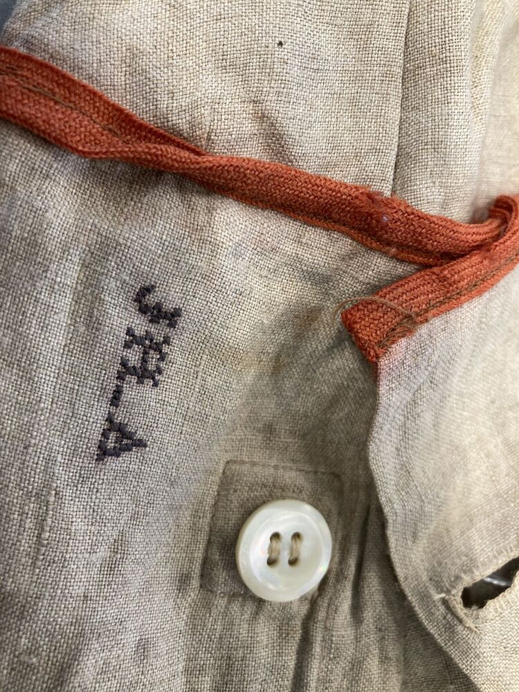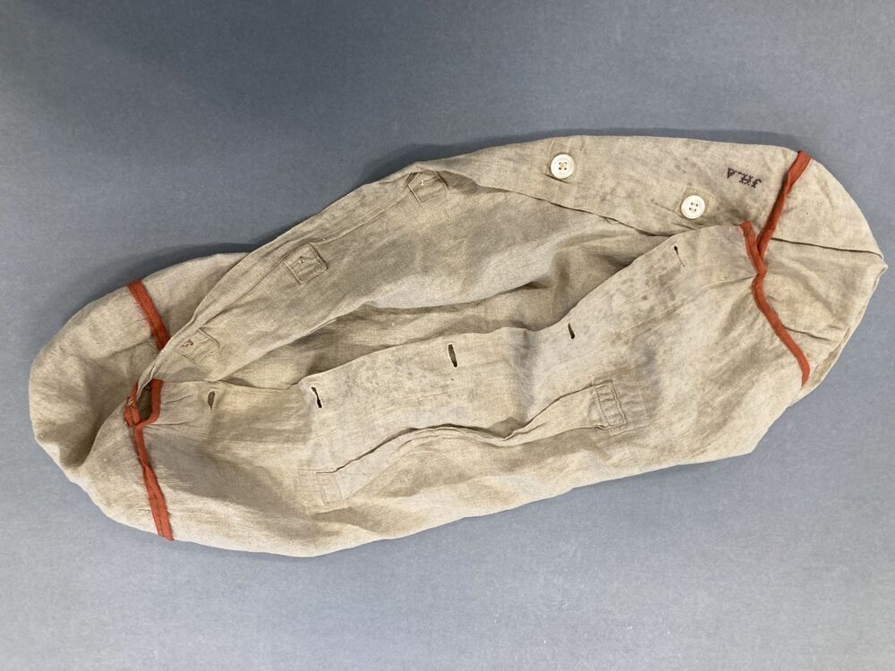 Naturelkleurig linnen reistas, langwerpig rond van vorm,gemerkt J H-A