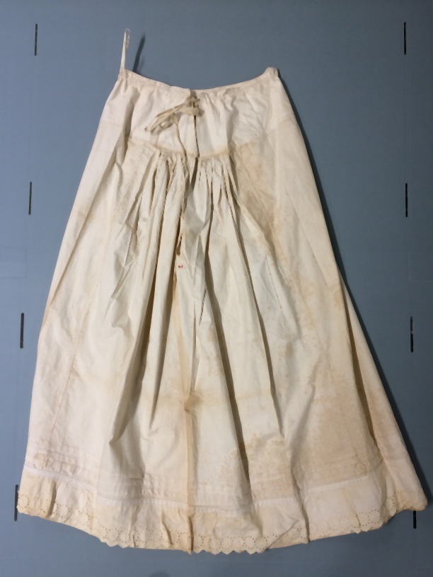 Onderrok van wit katoen, gerimpeld, aan een zijde broderie
