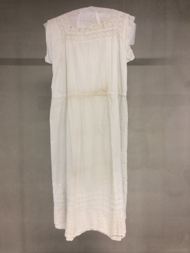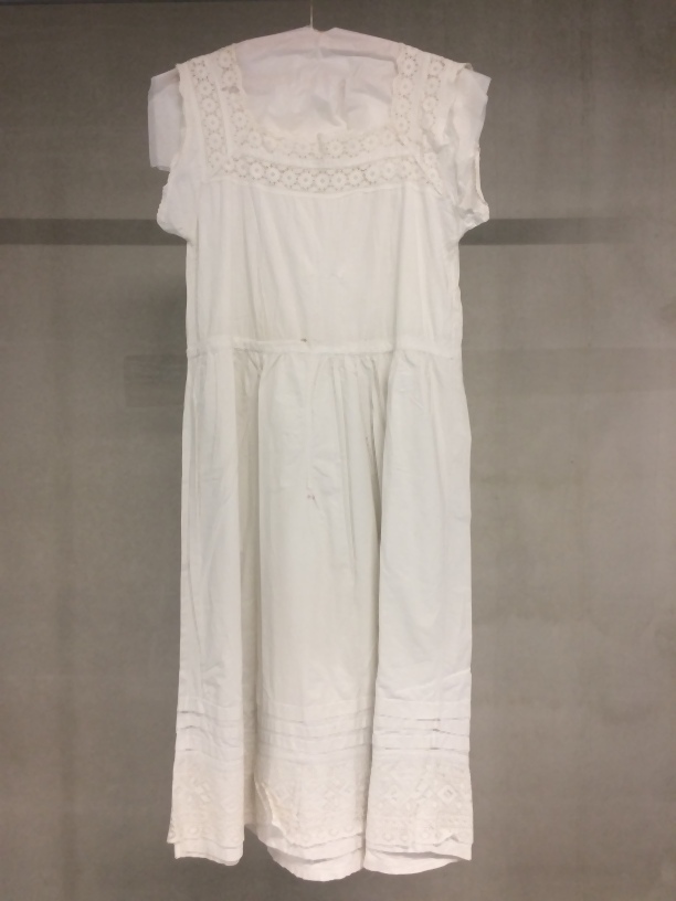 Onderjurk van wit katoen rok is van grover katoen dan lijfje, vierkante hals, broderie en machinaal kant