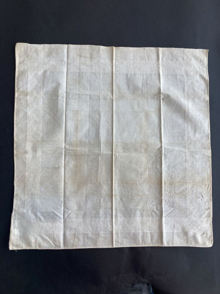 Wit katoenen zakdoek met damast randje en gebrocheerd hoekmotief.