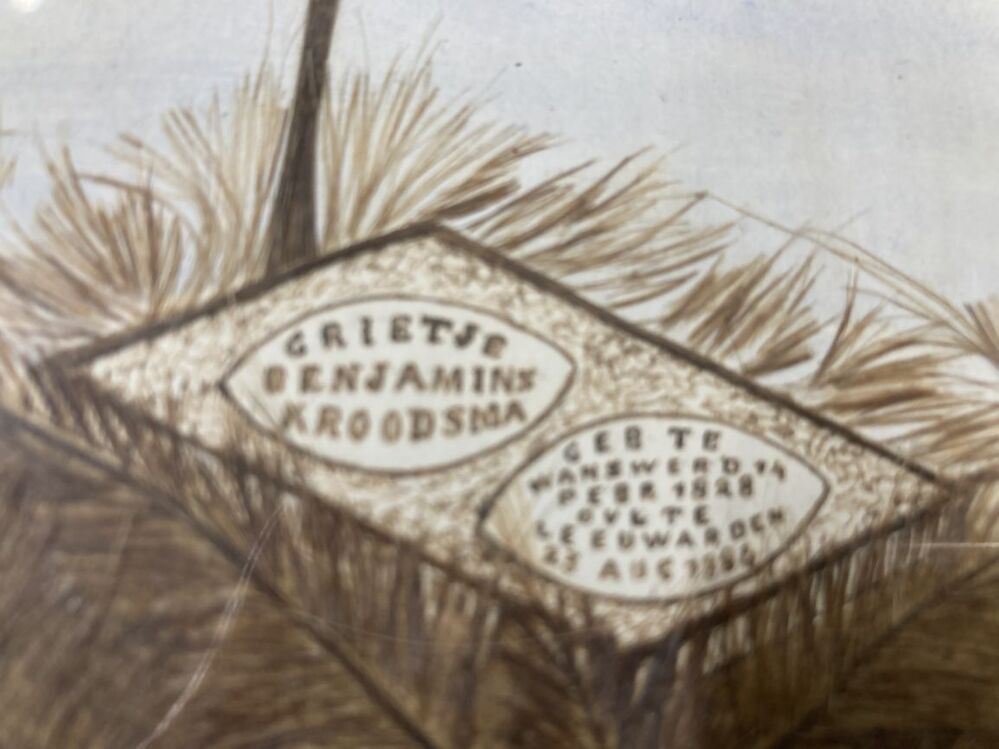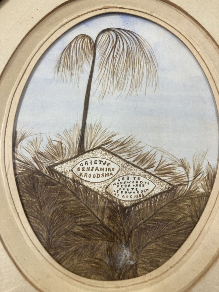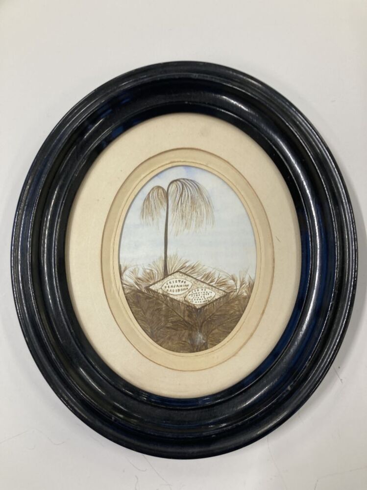 Haarschilderij met afbeelding van van grafsteen met treurboom en opschrift in zwart houten lijst