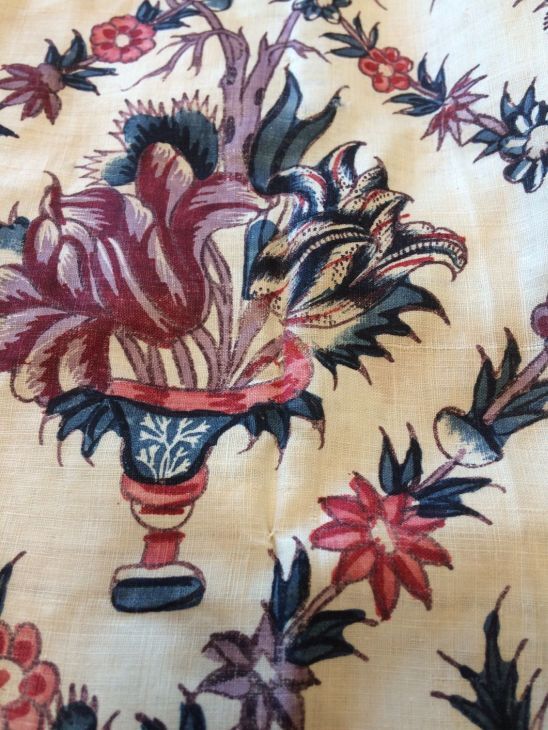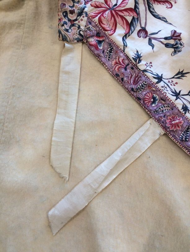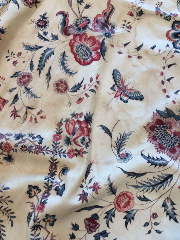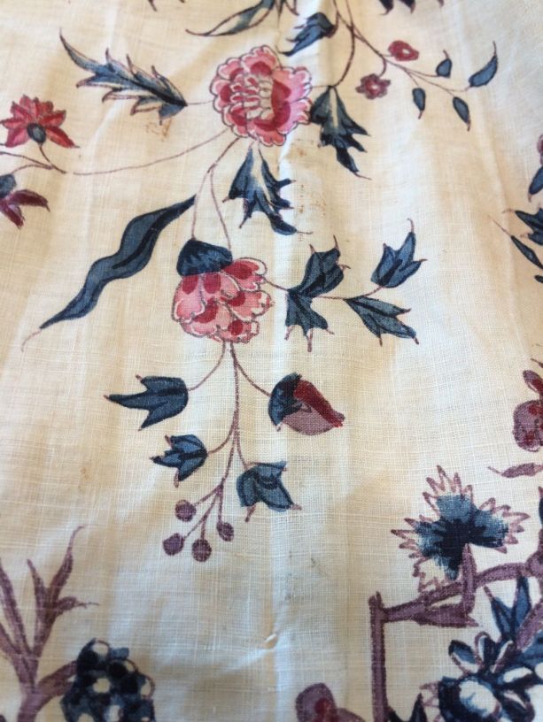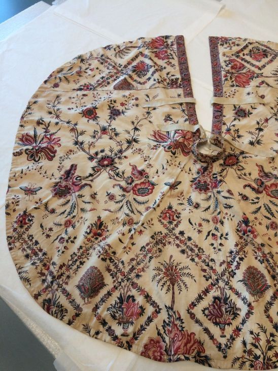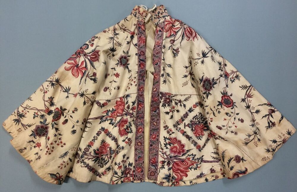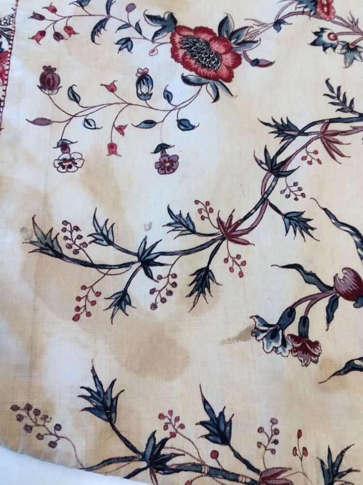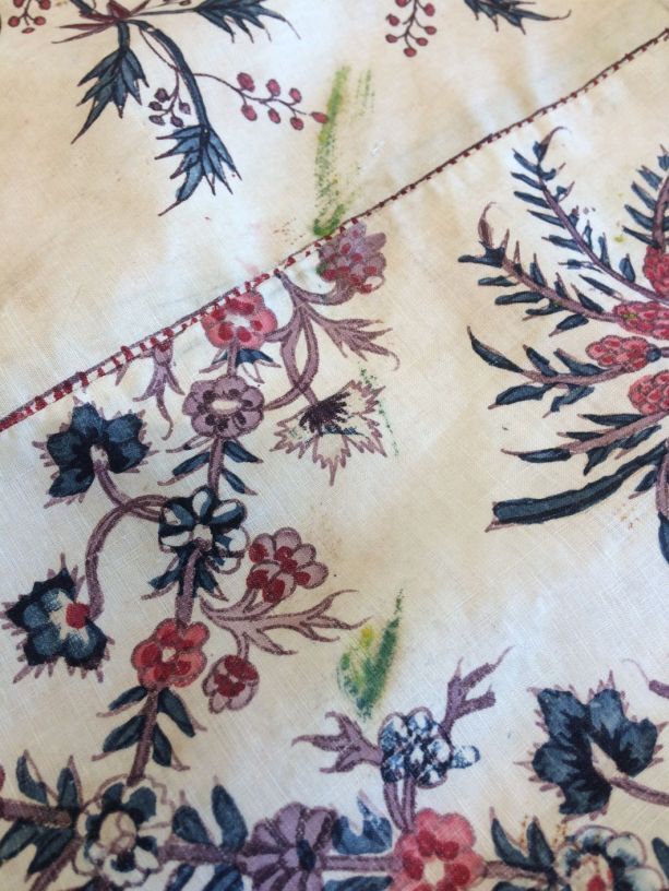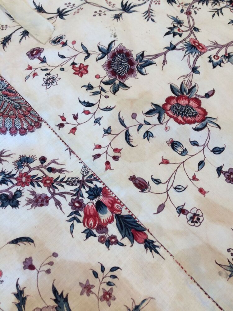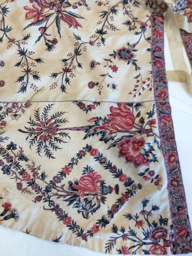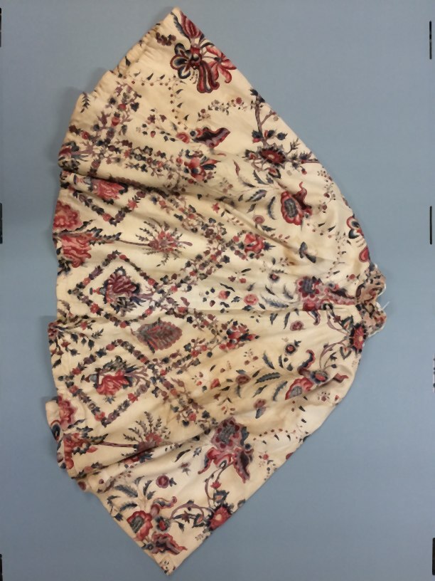Sitsen Hindeloper 'skooldermantel'of bedcape in cirkelvorm, vervaardigd van vrouwenrok met randmotieven op witte grond