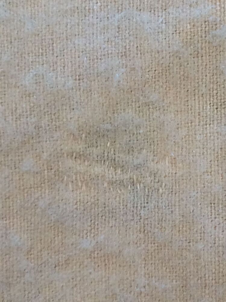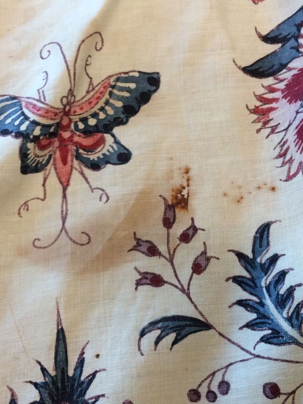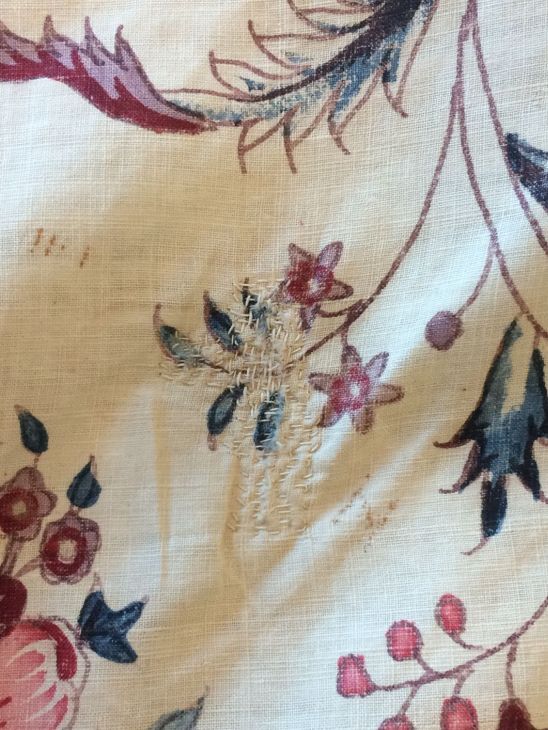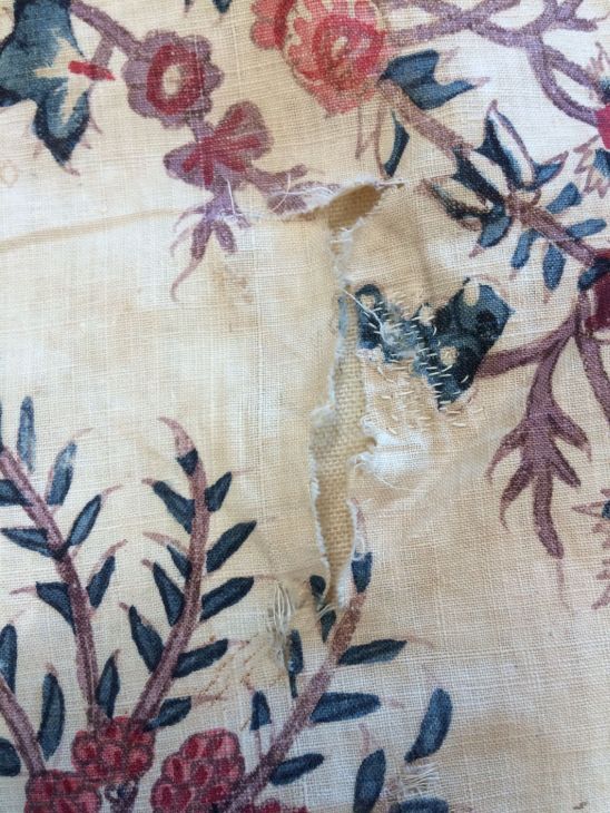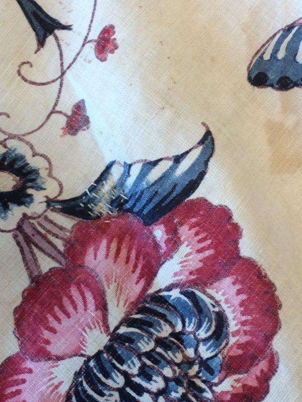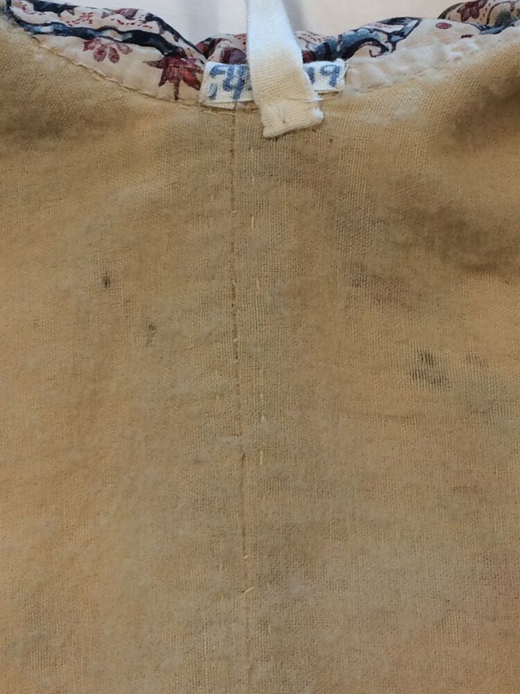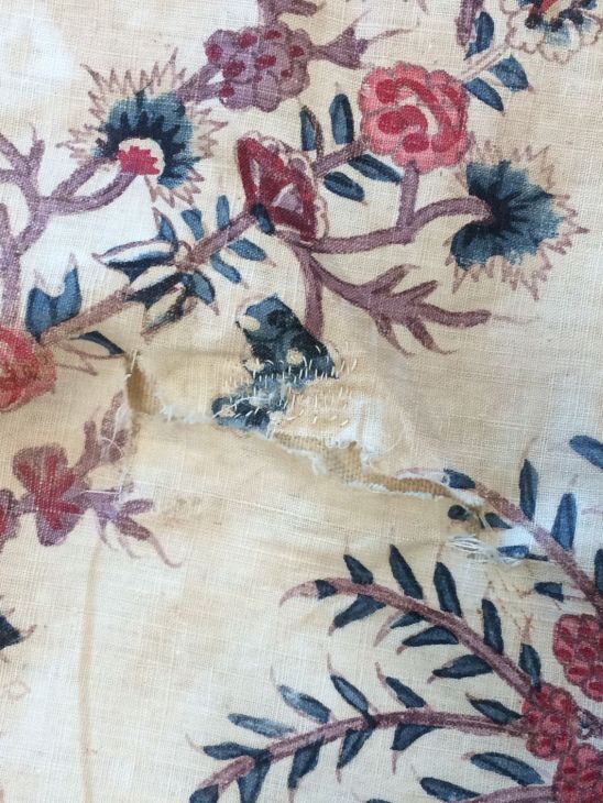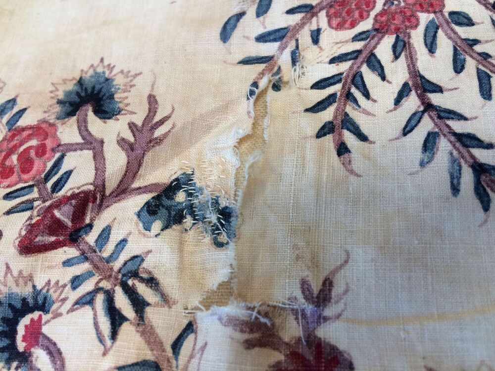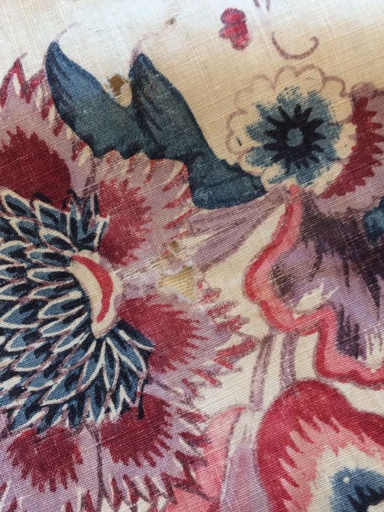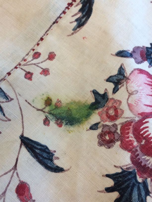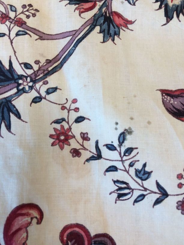 Sitsen Hindeloper 'skooldermantel'of bedcape in cirkelvorm, vervaardigd van vrouwenrok met randmotieven op witte grond