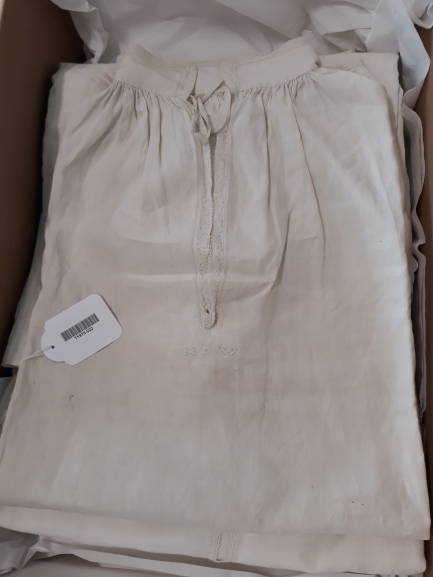 Mannenhemd met boorden manchetten van fijn wit linnen, afgezet met Hollands kloskant, met initialen H W