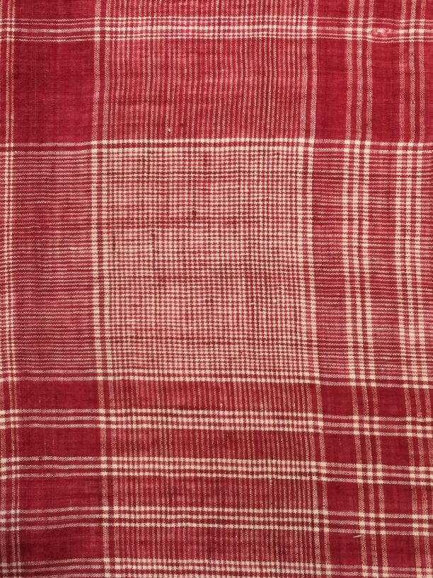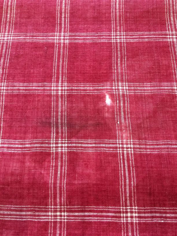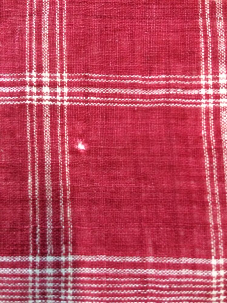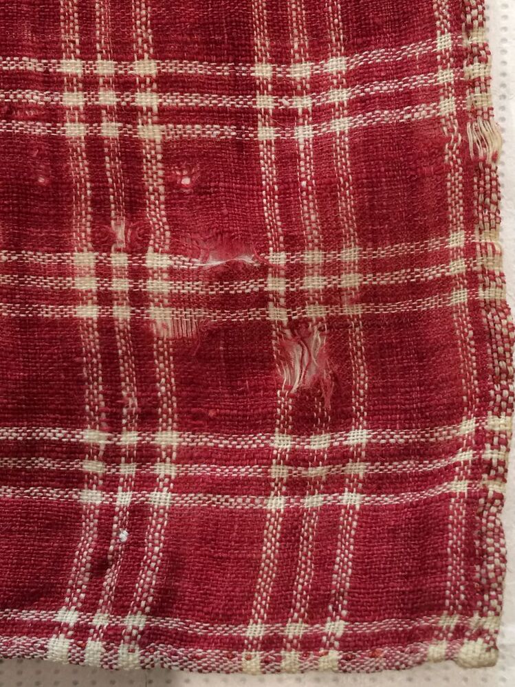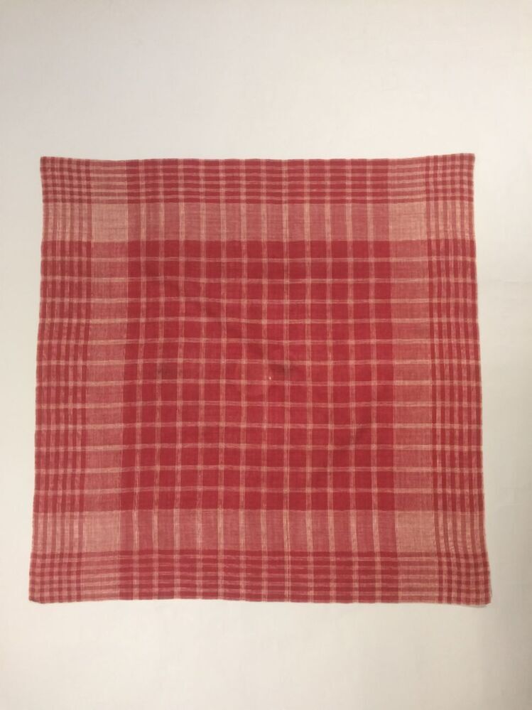 Vierkante doek van Hindelooper bont in rood en wit met ingeweven ruit, en rand 'lapkede'