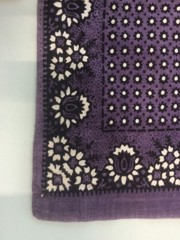 Vierkante bedrukte doek of sjaal in lichtpaars, zwart en wit, met uitgespaarde witte bloem in rand en stipjes op middenveld